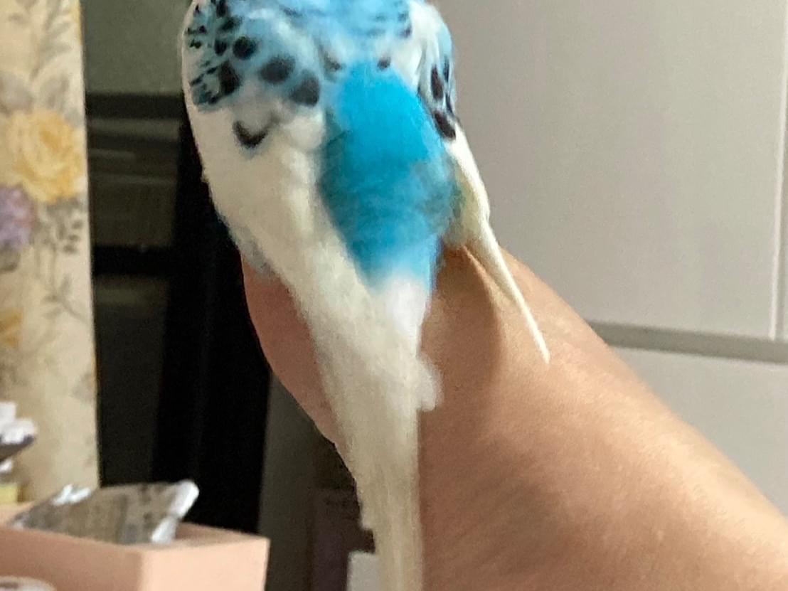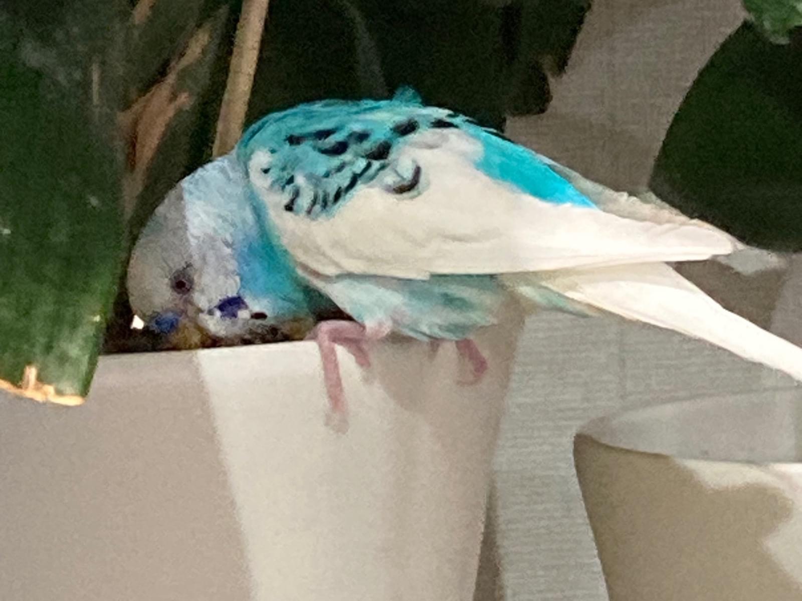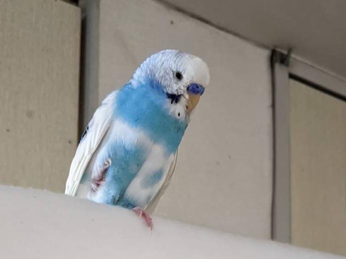 水色と白のセキセイインコです。くちばしは、黄色、鼻は紫、足は、ピンクです。