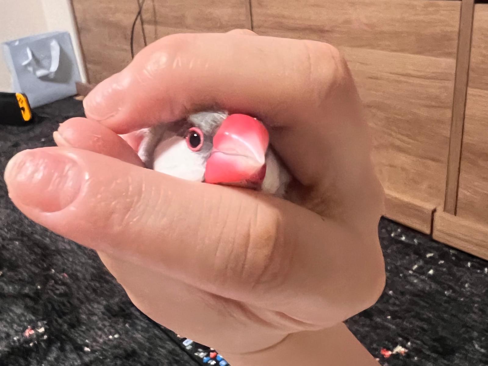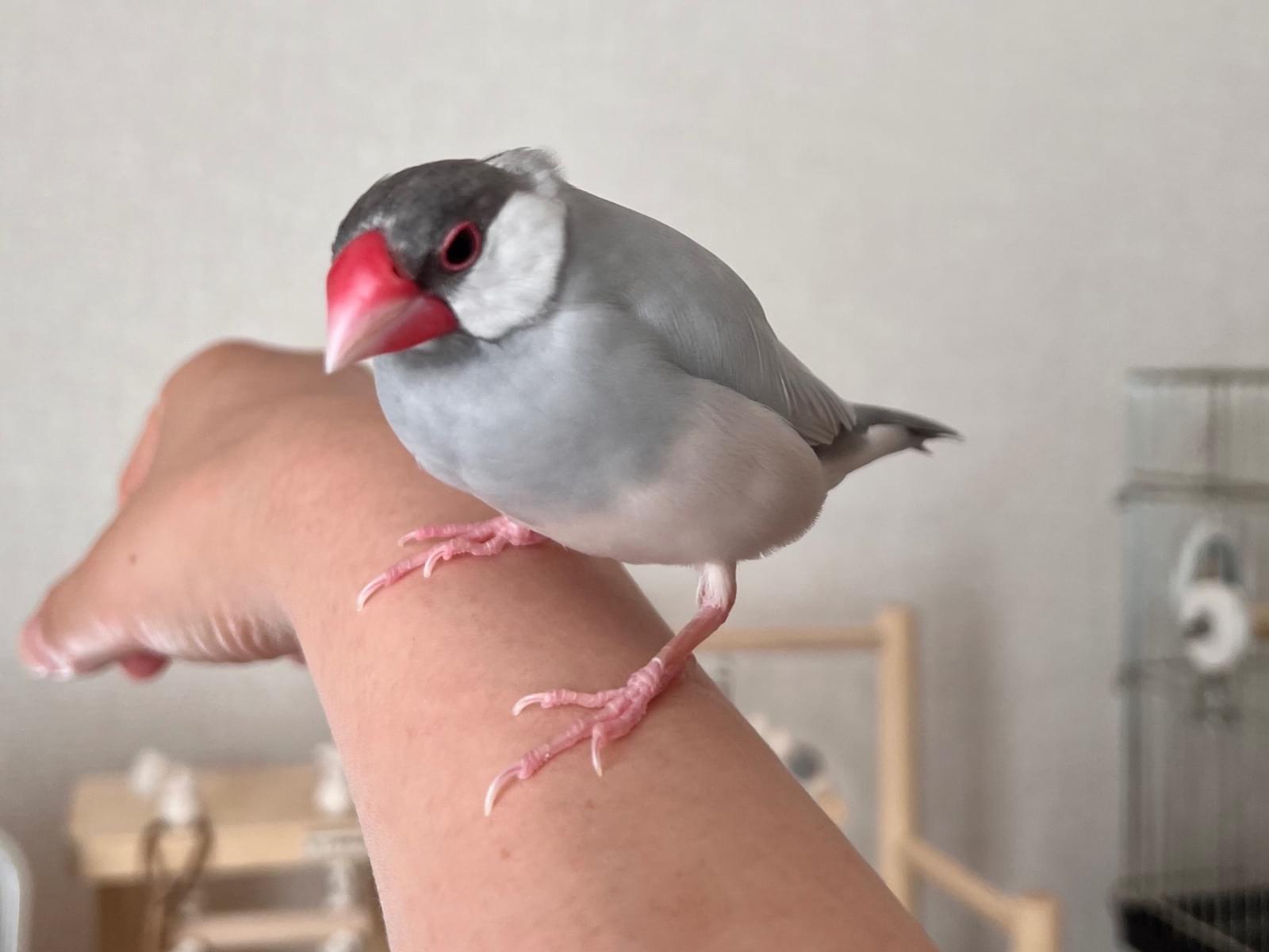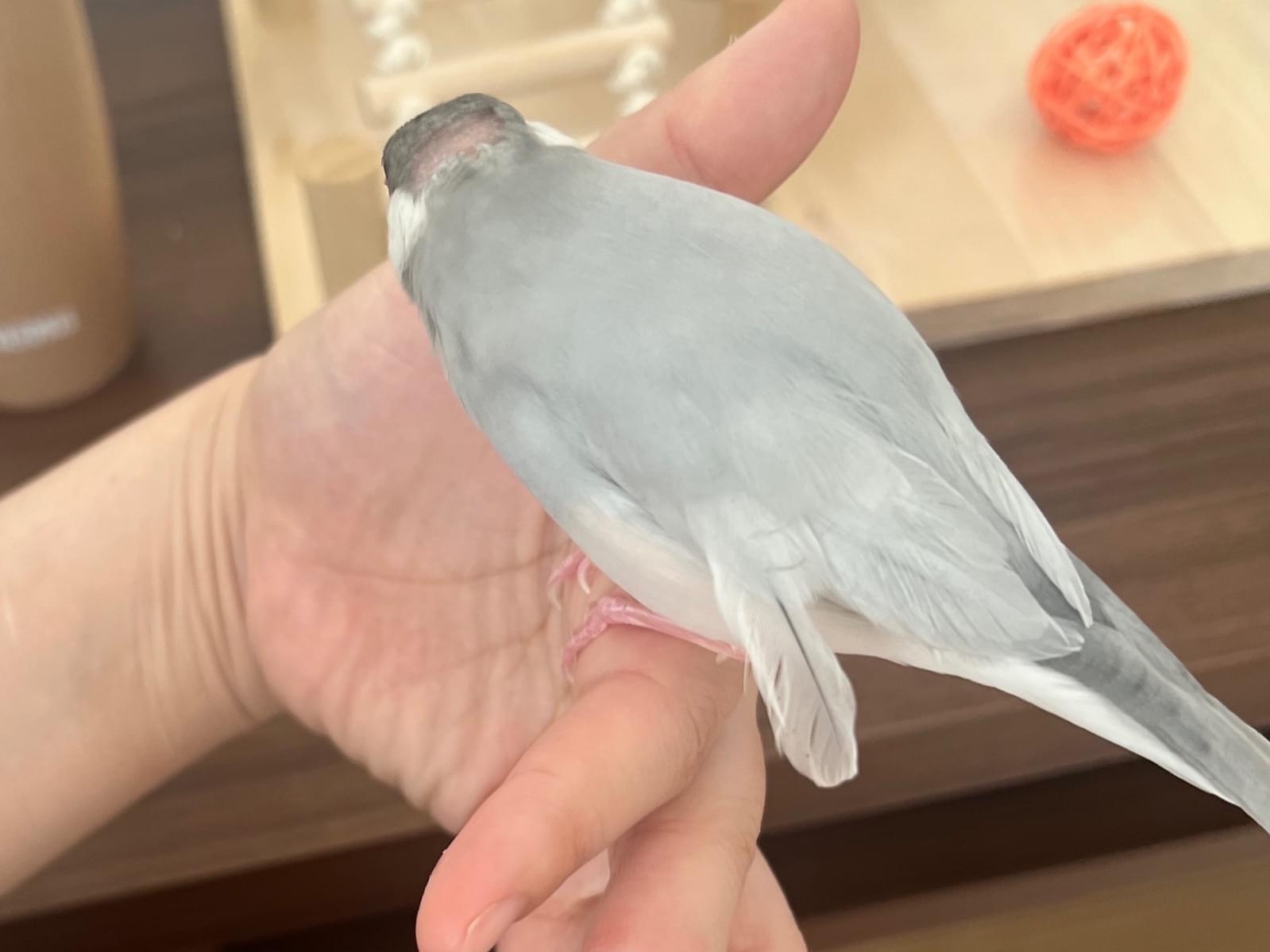 頭は濃いグレー、ほっぺたは白、体は薄いグレーのシルバー文鳥です。臆病な性格ですが、人には慣れています。手を叩いたり口笛を吹くと、手や肩の上に乗ります。追いかけると逃げますが、両手を広げて呼びかけると飛んできてくれたり、指や手をそっと近くに差し出すと乗ってきてくれたりします。