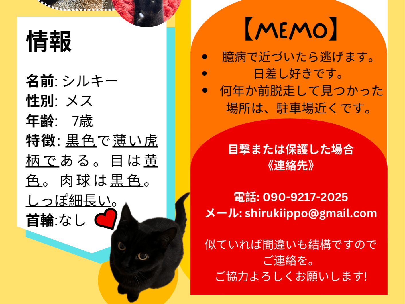 お名前はシルキーで臆病なねこちゃんです。見つけたとき、直ぐ逃げます。臆病な猫を見つけて保護することは難しいと思いますが、目撃情報や保護した場合は知らせてください!