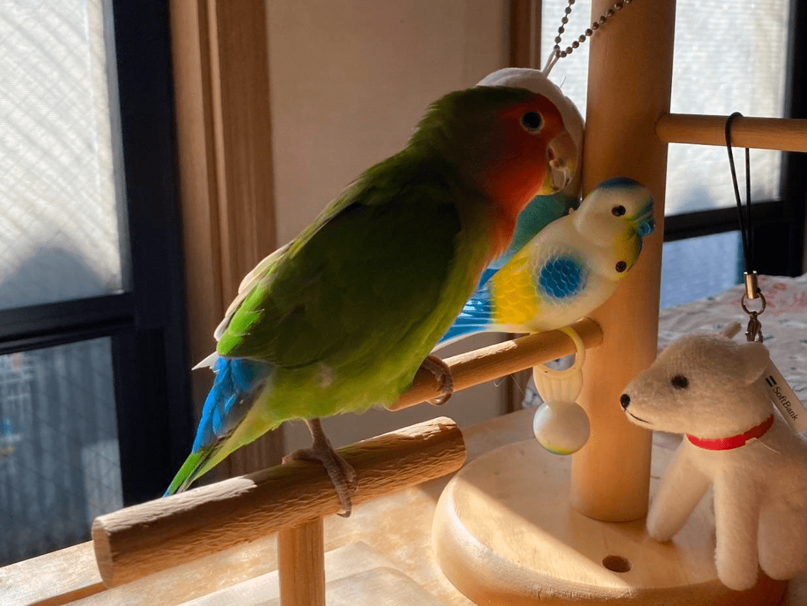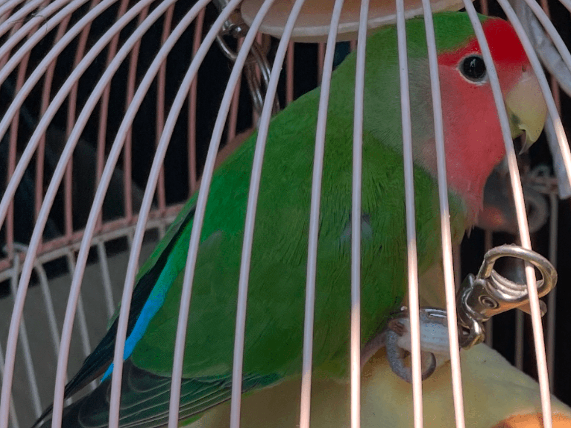 顔と胸が赤、頭と背中が緑のコザクラインコのメスをお預かりしています。
