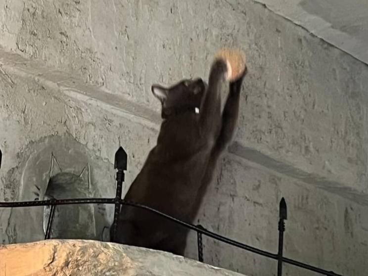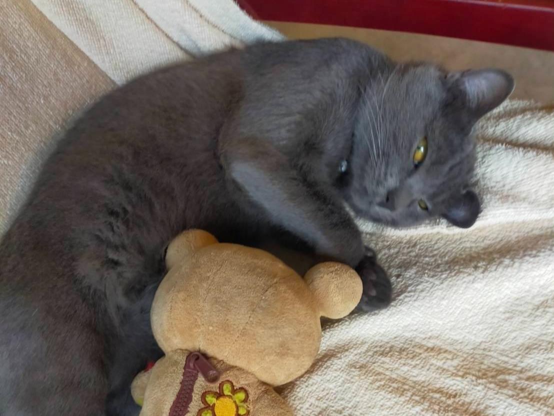 毛並みは、グレー一色で目が黄色に鈴がついた黒色の首輪をしてます