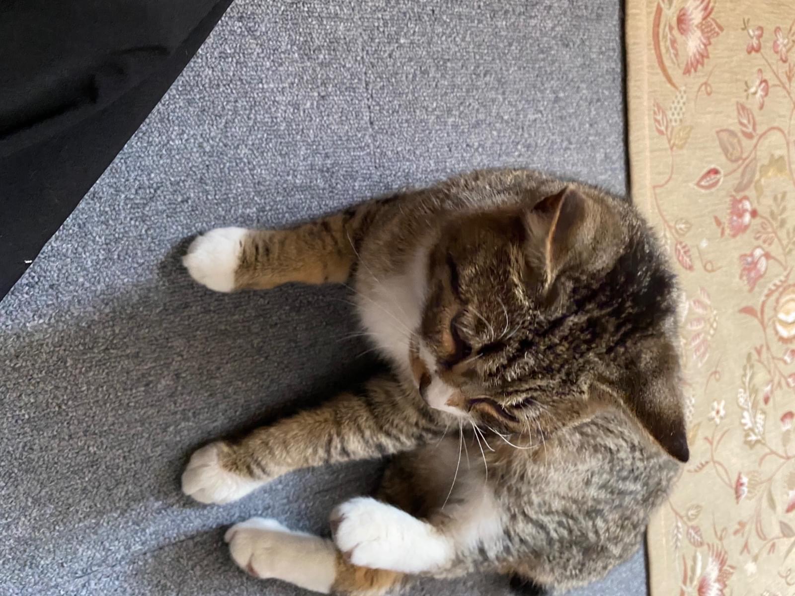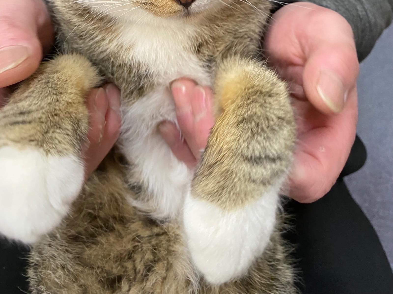 キジシロの去勢済みのオスです。手足の先が短い靴下を履いた感じで白いです。短いカギしっぽで青い猫顔柄の鈴付き首輪をしています。