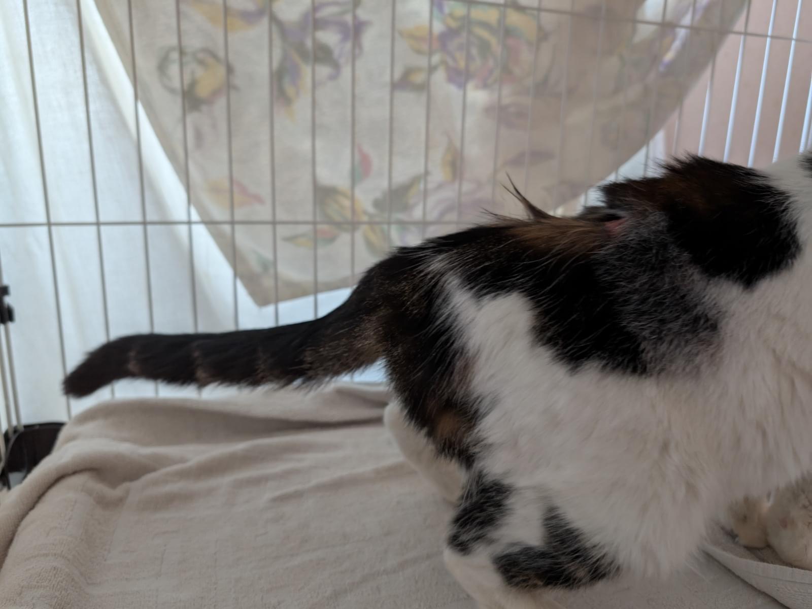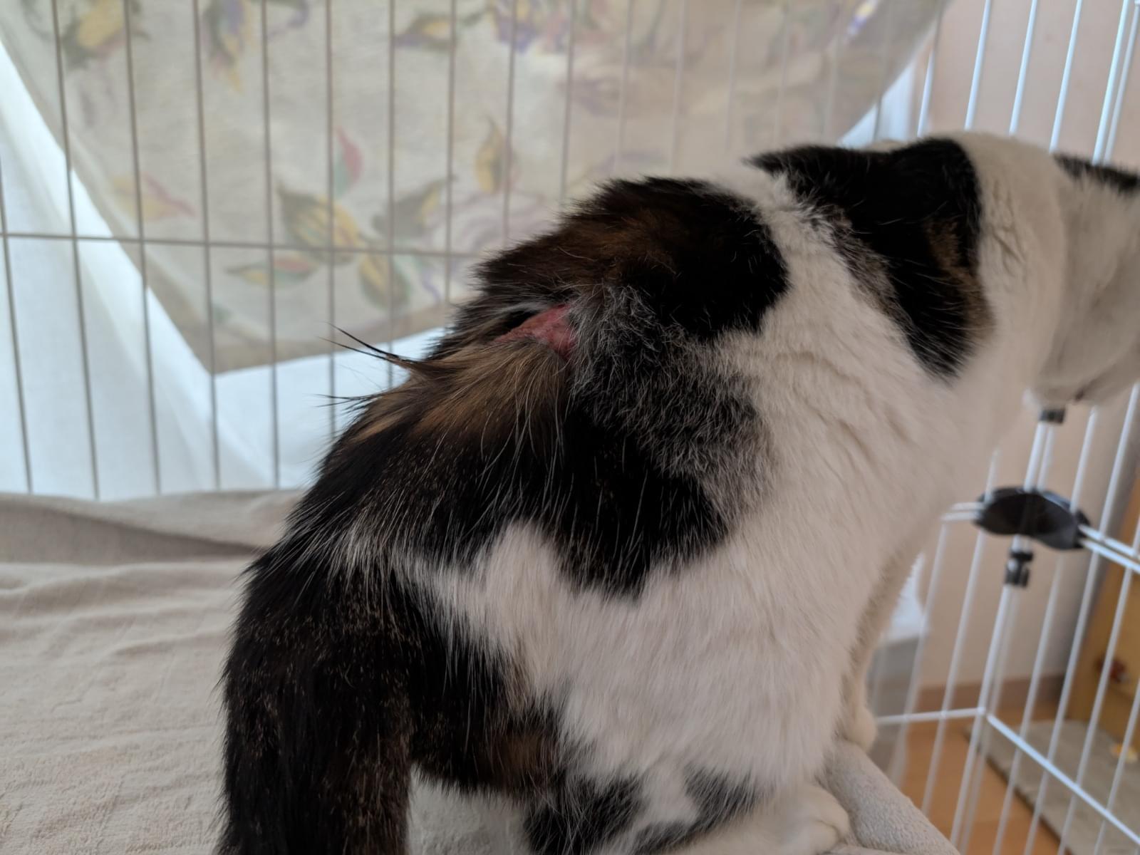 動物病院で診察してもらい、皮膚炎とのこと。現在は抗生物質を飲んで治療中です。