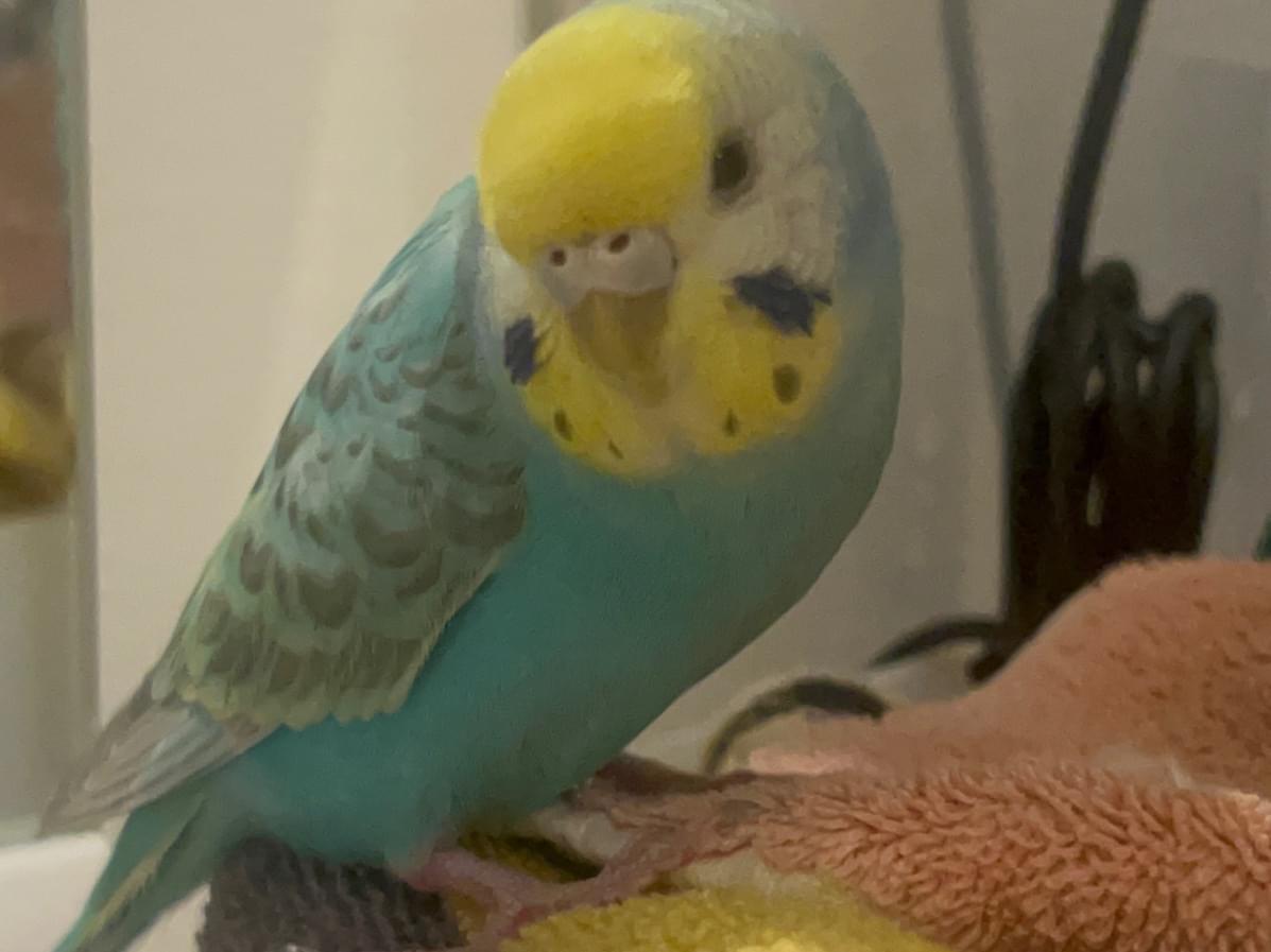 体が水色、頭が黄色、頬に青い雫型の模様があります。
