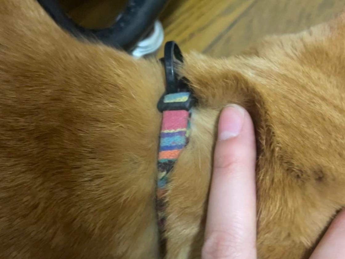 手作りのような青ベースの首輪が、壊れていて結束バンドで補強されていました。