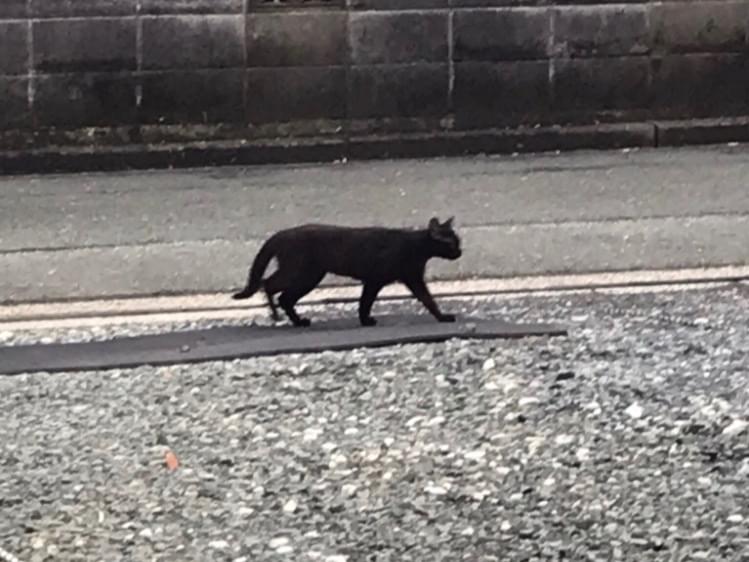 黒猫、メス、両耳サクラカット、目の色黄緑、しっぽかなり長め、顔小さく、全体的細身。