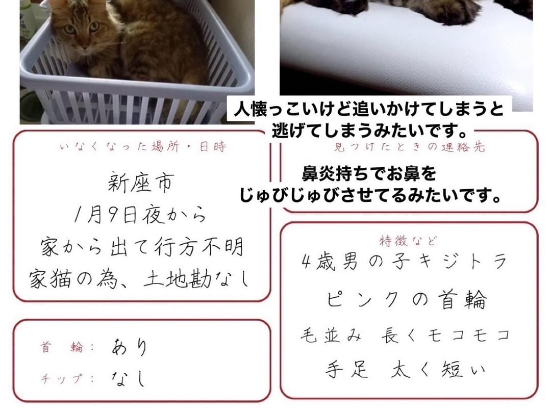 ホーム迷子猫埼玉県キジトラ、手足短いキジトラ、手足短い管理編集するポスター掲載終了最終更新日時:2025/01/16 08:38写真情報用件迷子名前まりも性別オス年齢4歳場所埼玉県 にいざし発生日時2025年1月9日(木)飼い主にしかた説明キジトラの 手足が短くモコモコしてます。 鼻炎持ちの為、鼻がぐじゅぐじゅしてます。 家猫なので土地勘なしです。 見かけたらご連絡お待ちしております!連絡先URL未設定掲示板情報交換のための掲示板です。ユーザーからの情報提供、オーナーからの連絡などにご利用下さいませ。コメントを書き込む4/14茶色の猫を夜中に見かけました慶応返信0件2025/04/14 11:57