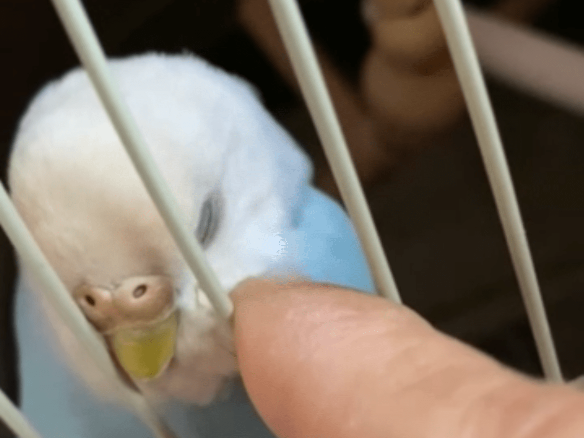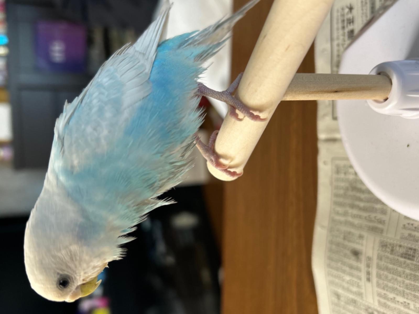 色は白と水色のスパングルで、目の下も白いメスのインコです。