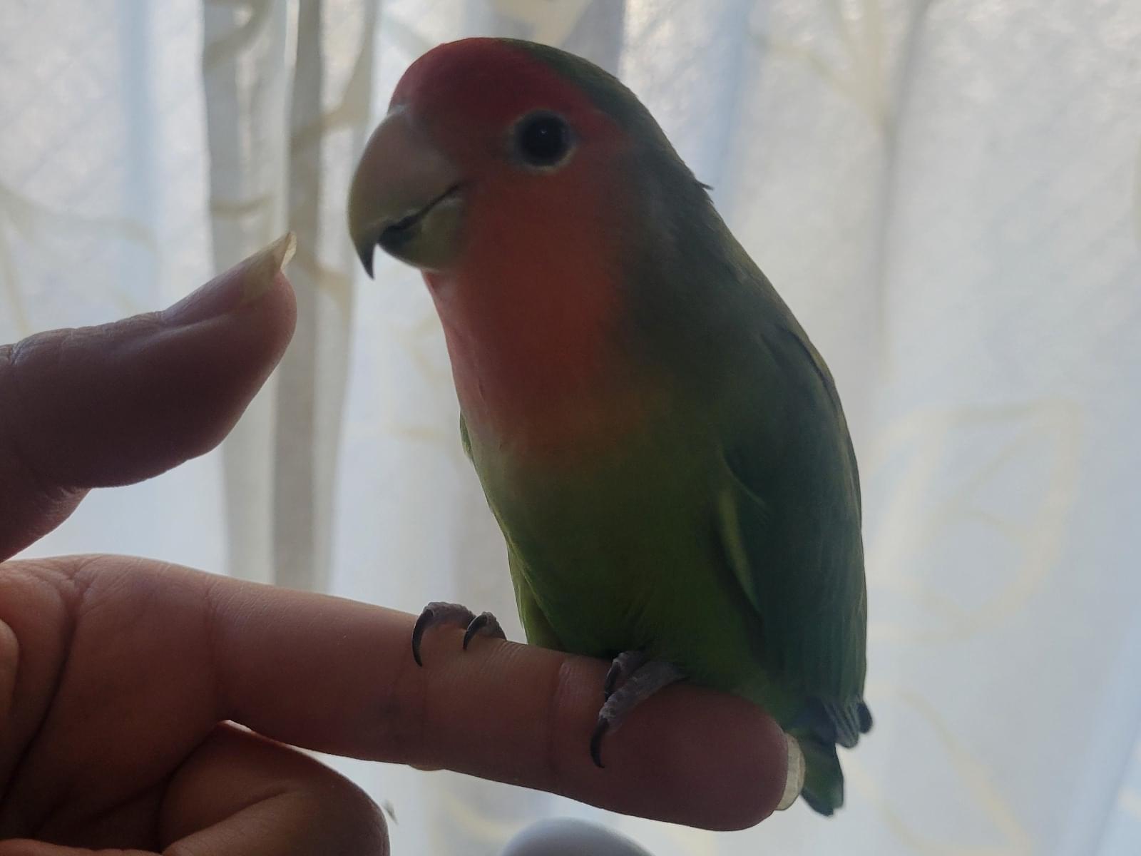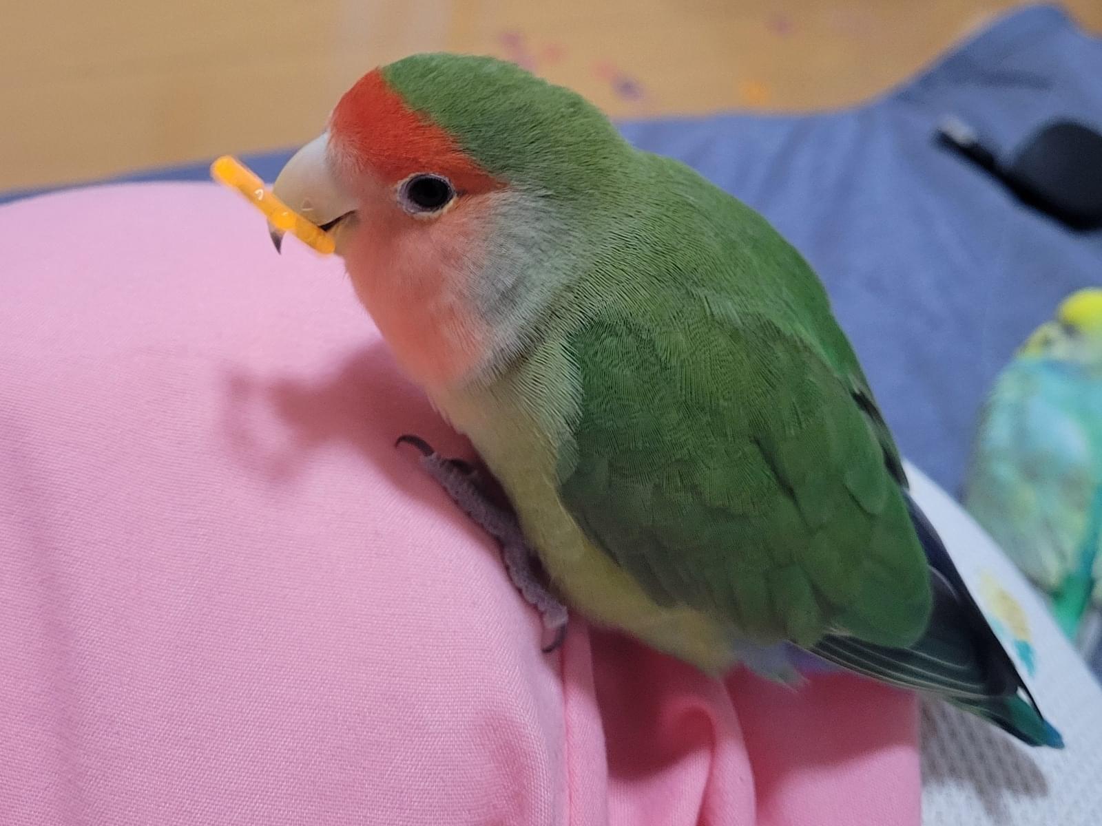 体が緑、顔がオレンジのノーマルなコザクラインコです。