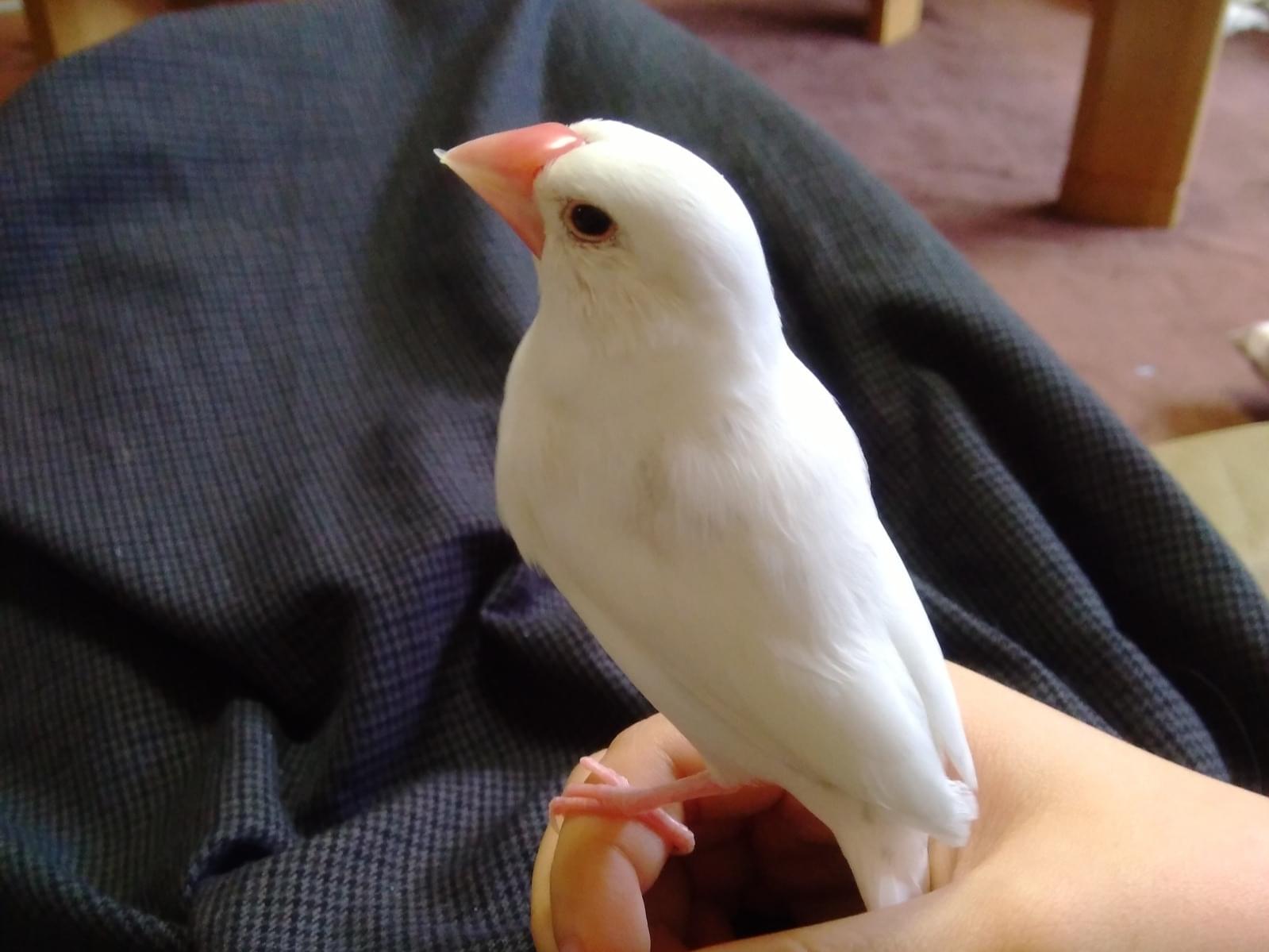 そこそこ人馴れしたまだ幼い白文鳥です。