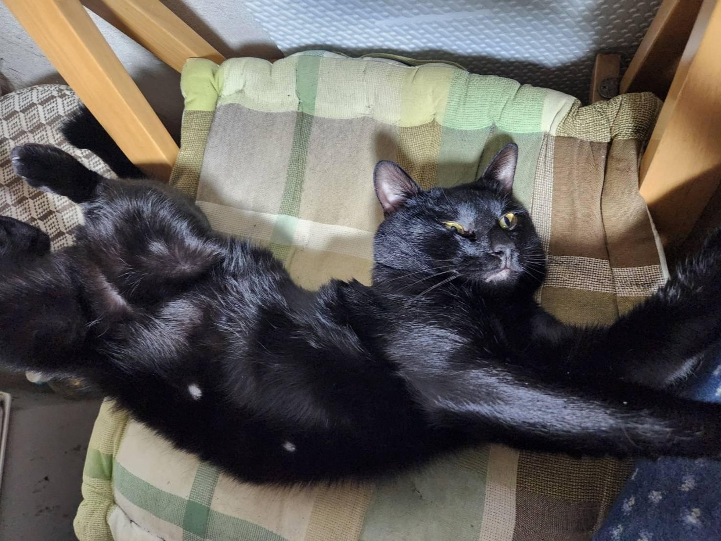 全身真っ黒の去勢していない雄猫で、5キロ程のちょっと大きな子です。尻尾は15cmくらいで、途中でぶつ切りにされたような中途半端な長さが特徴的です(わかりにくいですが画像ご参照ください)。また、首輪などの目に付くものは着けていません。