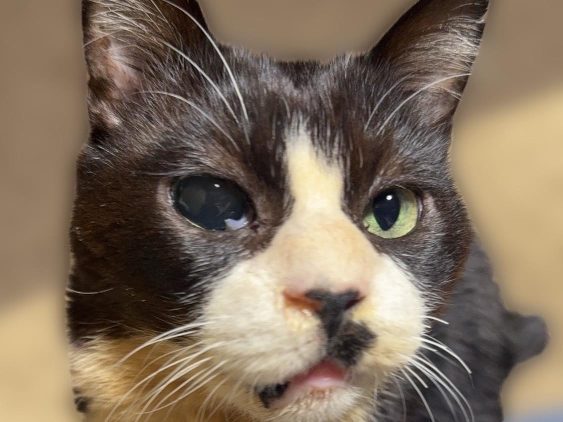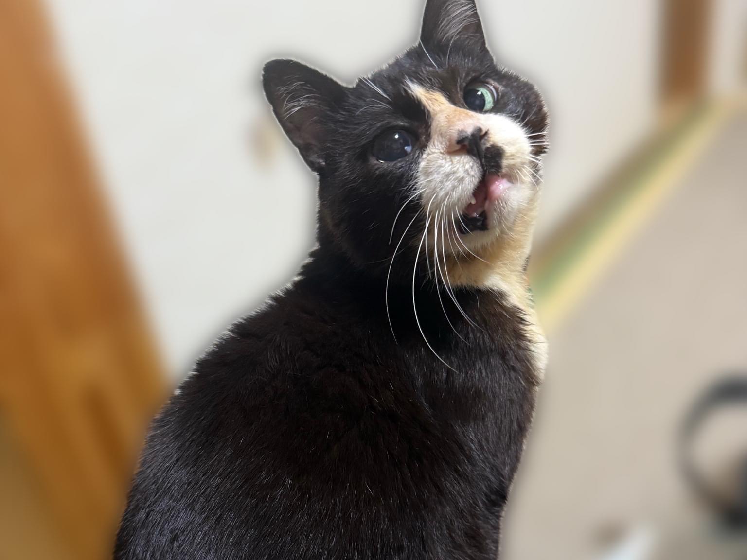 黒白ハチワレ、事故の影響で右目が失明して瞳孔が開いています。
