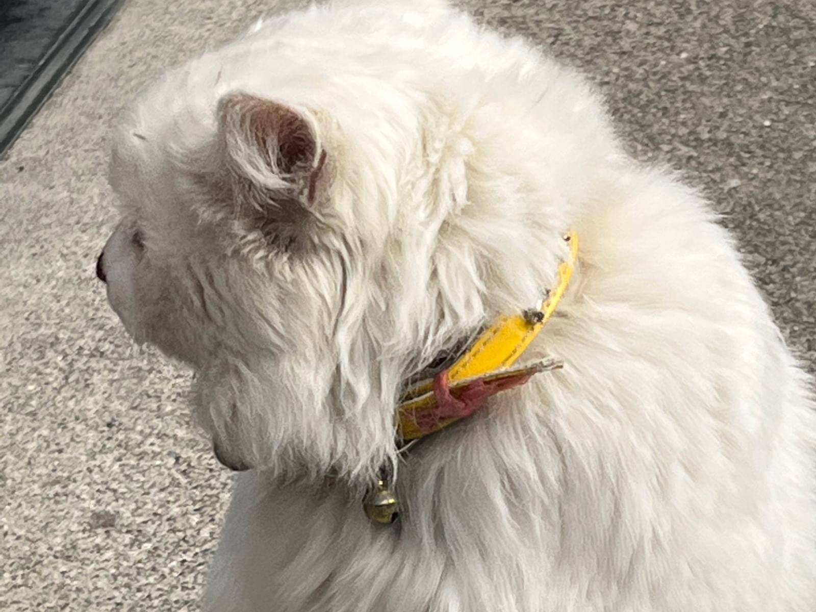 黄色に銀色のスタッズと鈴がついた首輪と、緑色にストライプ柄のリボンのバンドを付けています。長いこと付けていた影響からか、バンドが擦れて首の周りが傷になっていました。