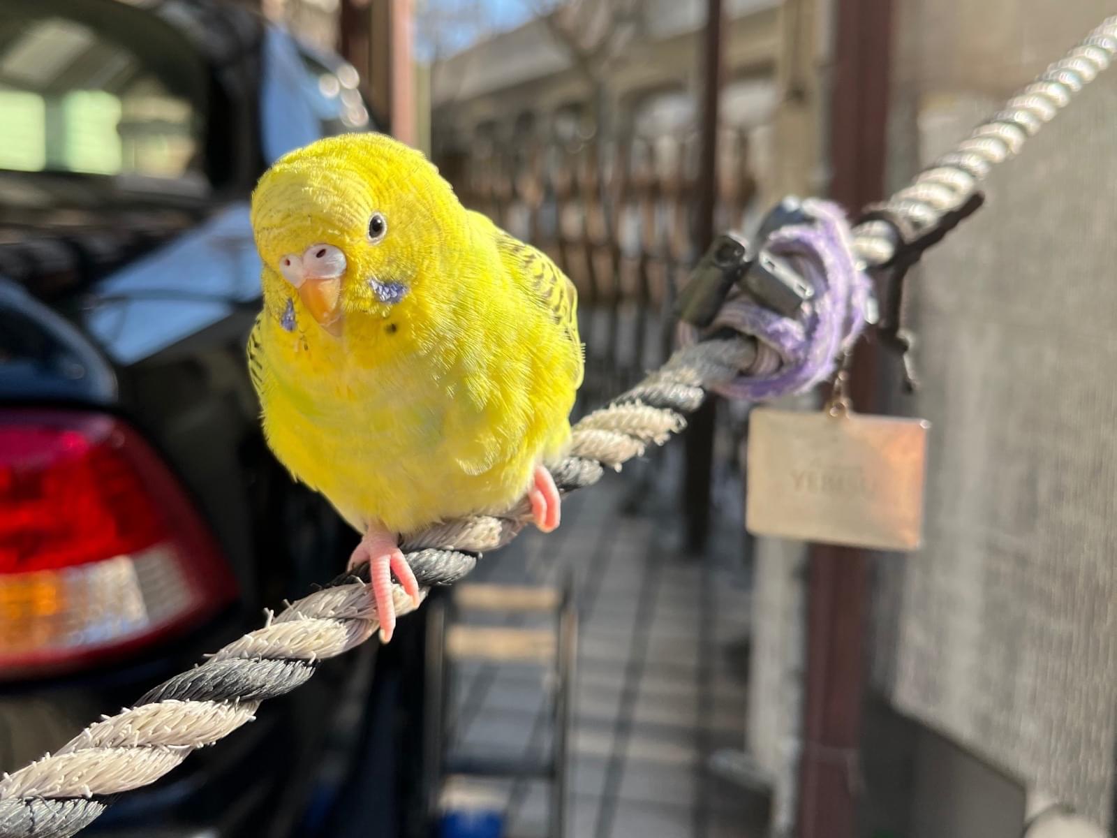 2025/01/28午前10時頃、高槻市役所近くの薬局さんの駐車場のロープに黄色セキセイインコがとまっていました、念の為薬局さんに書きましたが知らないとの事でしたが、出かけ先に向かっていた為何も出来ずゴメンなさい。同じ様な写真しかなくてすみません。