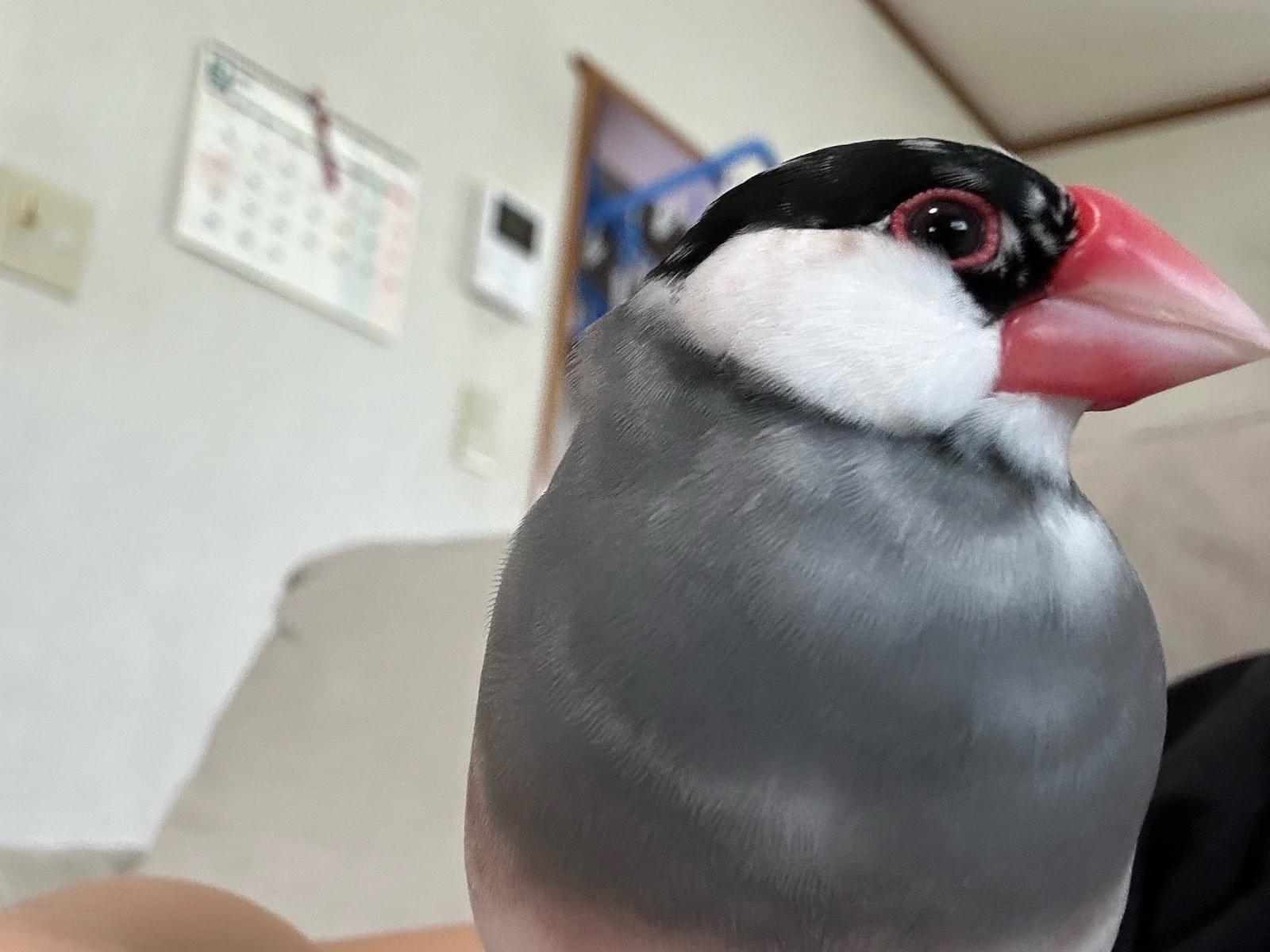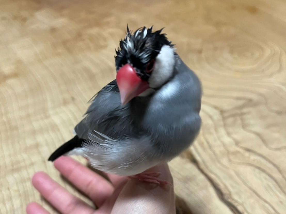 ぱっと見は桜文鳥のような見た目で、頭がごま塩模様になっています。