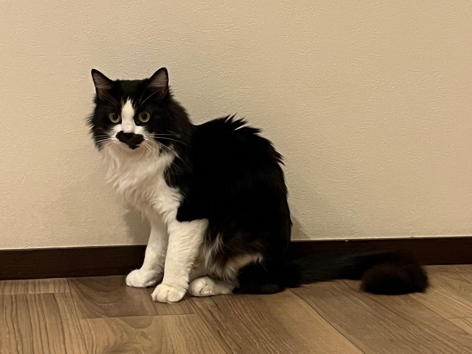 ちょび髭模様が特徴のハチワレ猫ちゃんを自宅敷地内で子供が保護しました。
