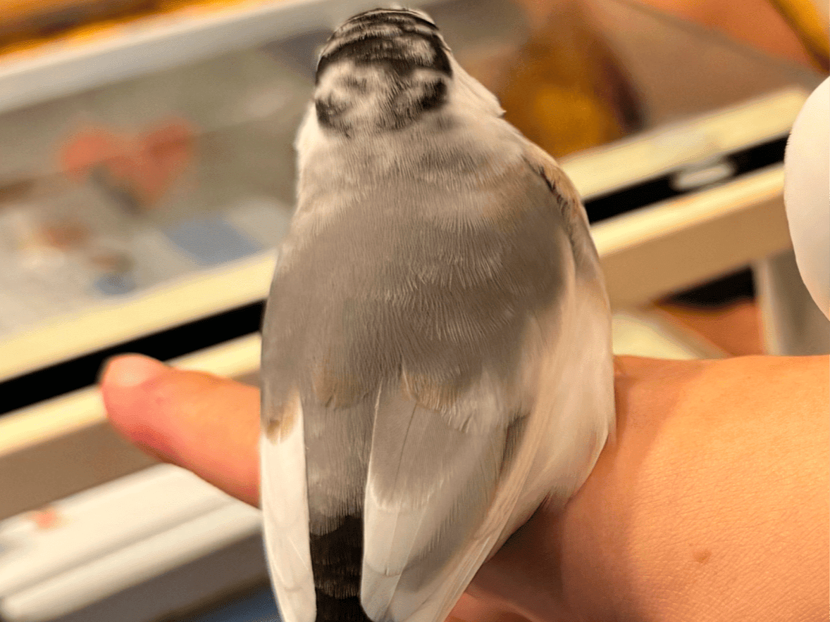 色…ごま塩で、頭は白黒まだら、背中は灰色、少し茶色の羽混じりです