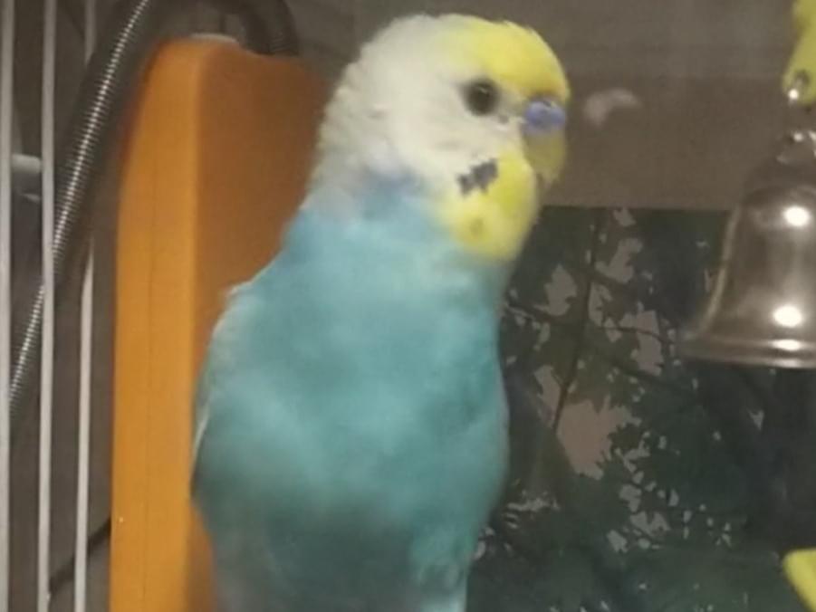 背中とお腹は水色、羽は黄色や淡い水色が入ったグレー、頭は黄色、尻尾は青や緑