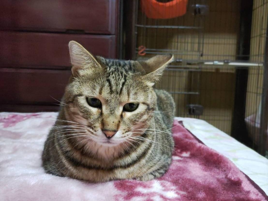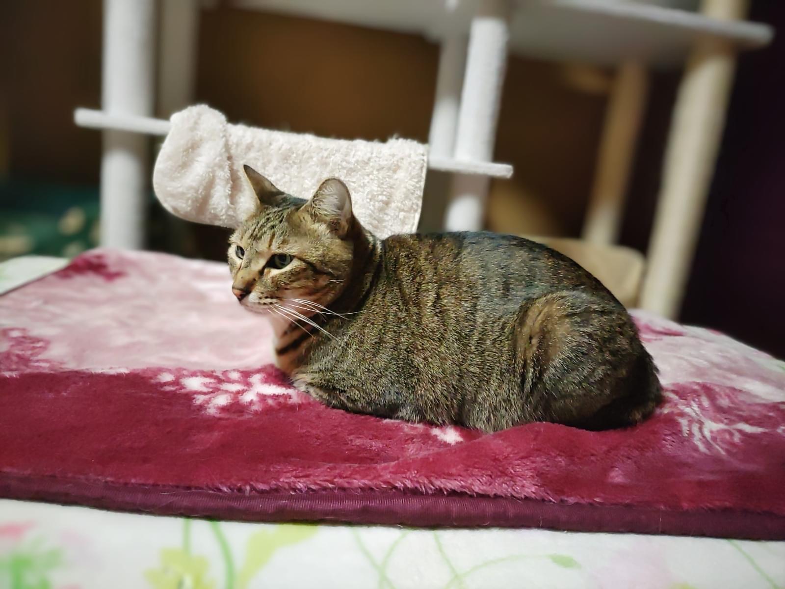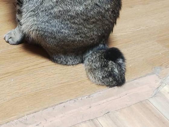 キジトラ去勢済雄・鍵尻尾ですが先が2段階半程折れているので尻尾の先が四角っぽく見えます。