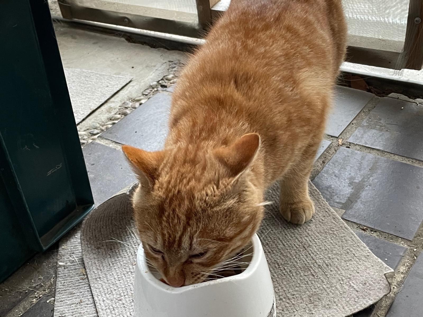 オドオドしていますが、近くでご飯をあげても大丈夫なので、飼い猫かもしれません。