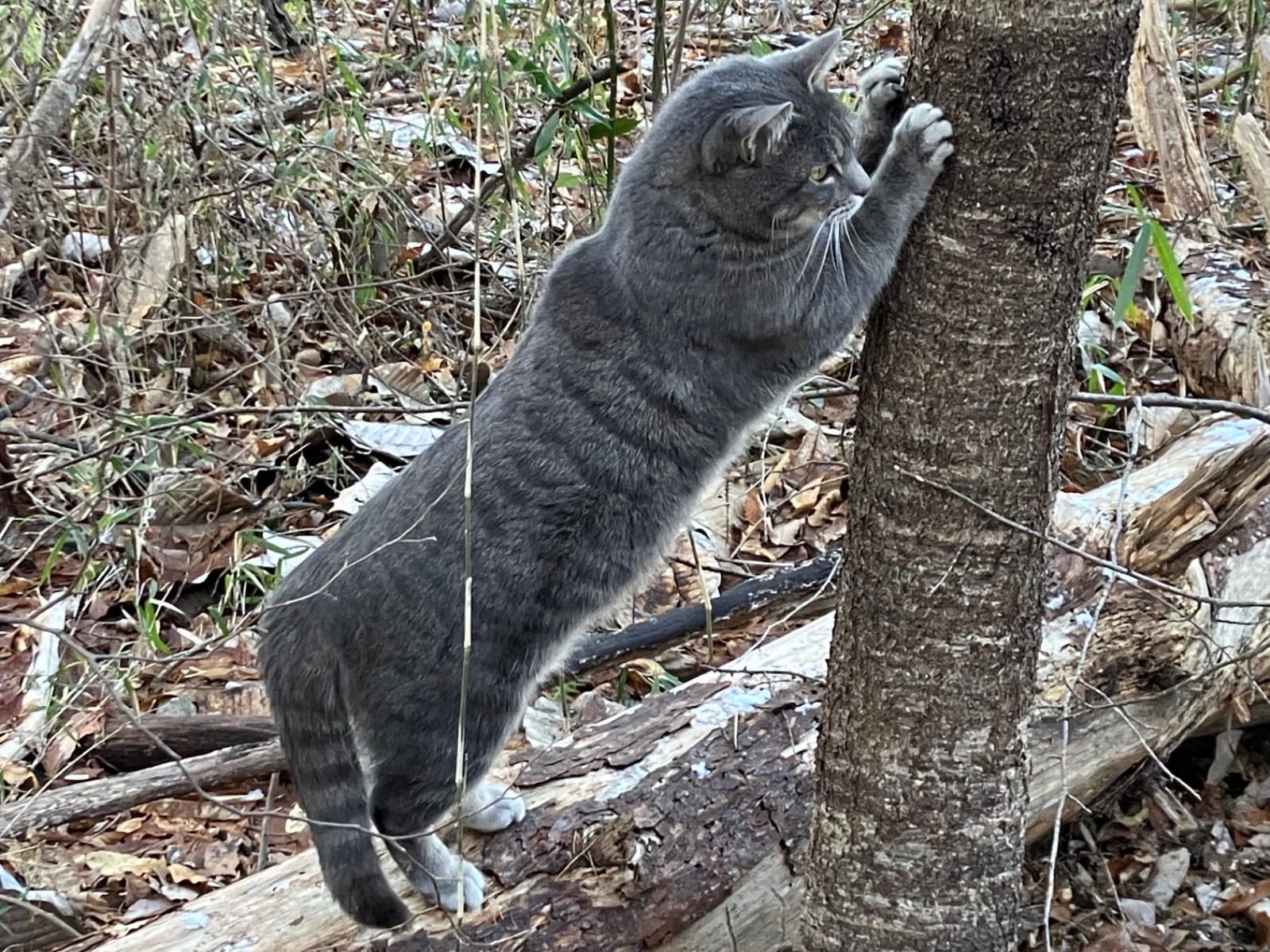 ・ロシアンブルーのような灰色のサバトラ、腰あたりがヒョウ模様