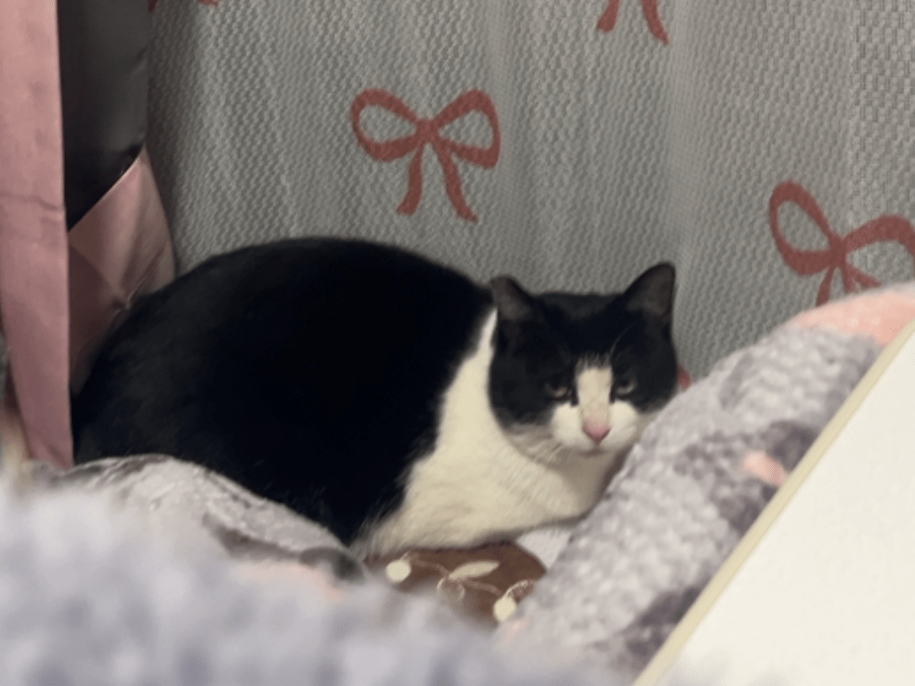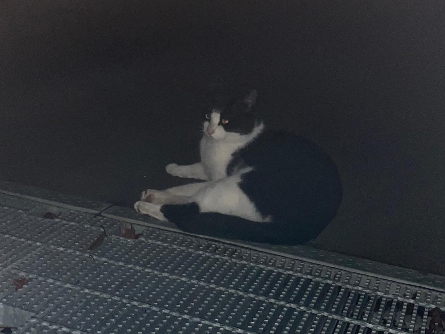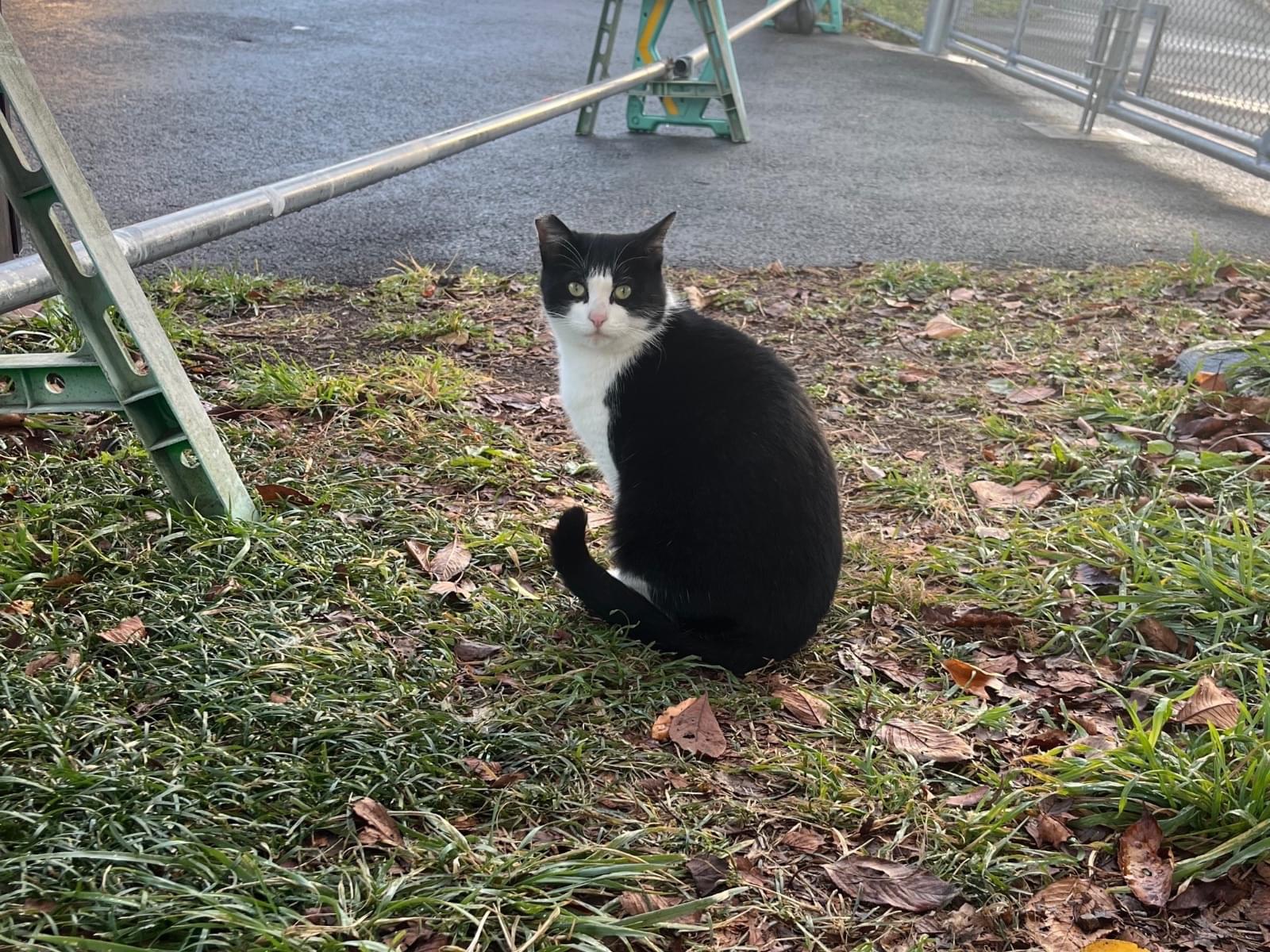 黒白のハチワレです。去勢済みの男の子です。右耳がカットされている元地域猫です。首輪はしてません。ビビりな性格ですが、ご飯が大好きです。なんでも食べる子です。
