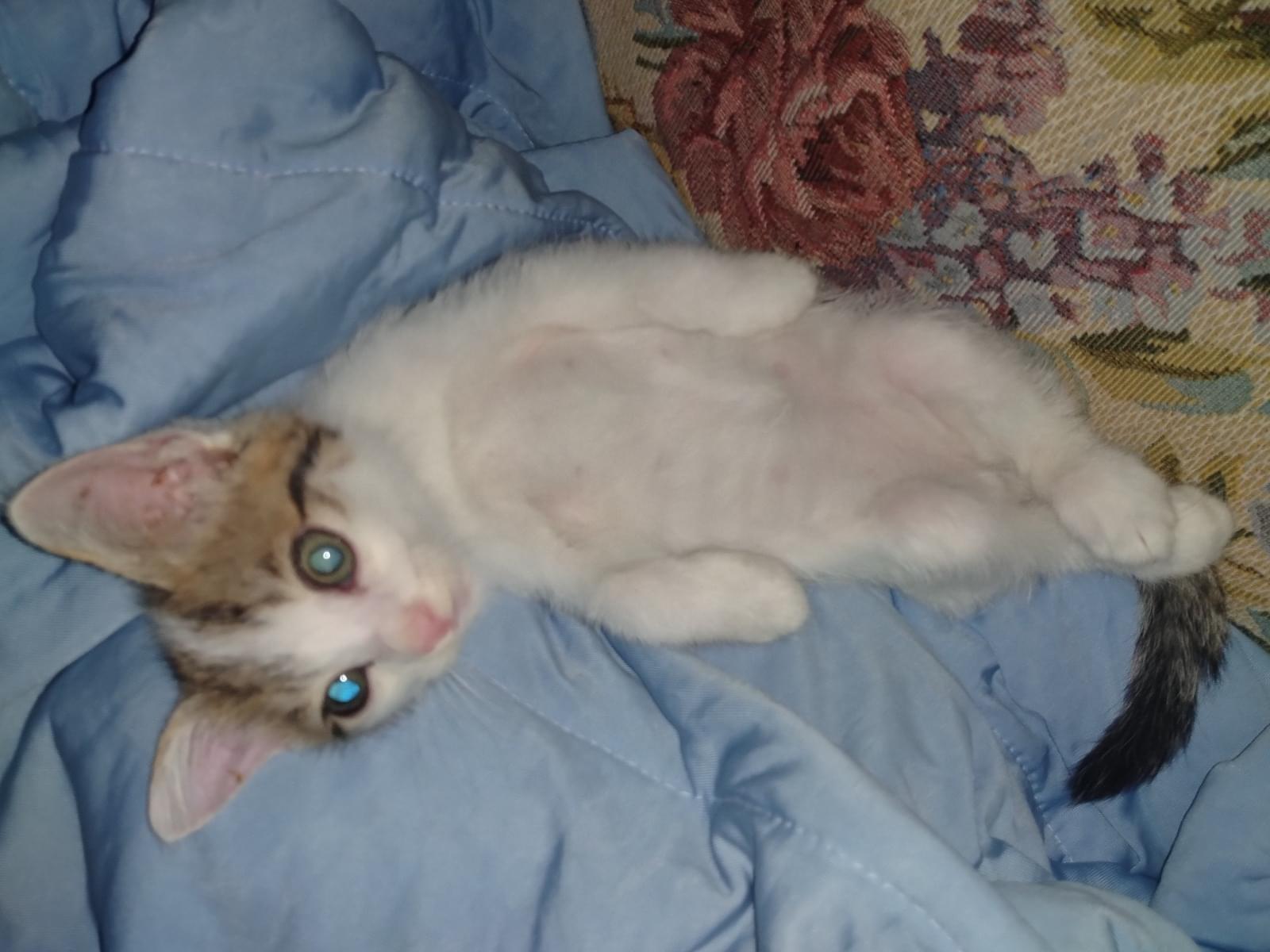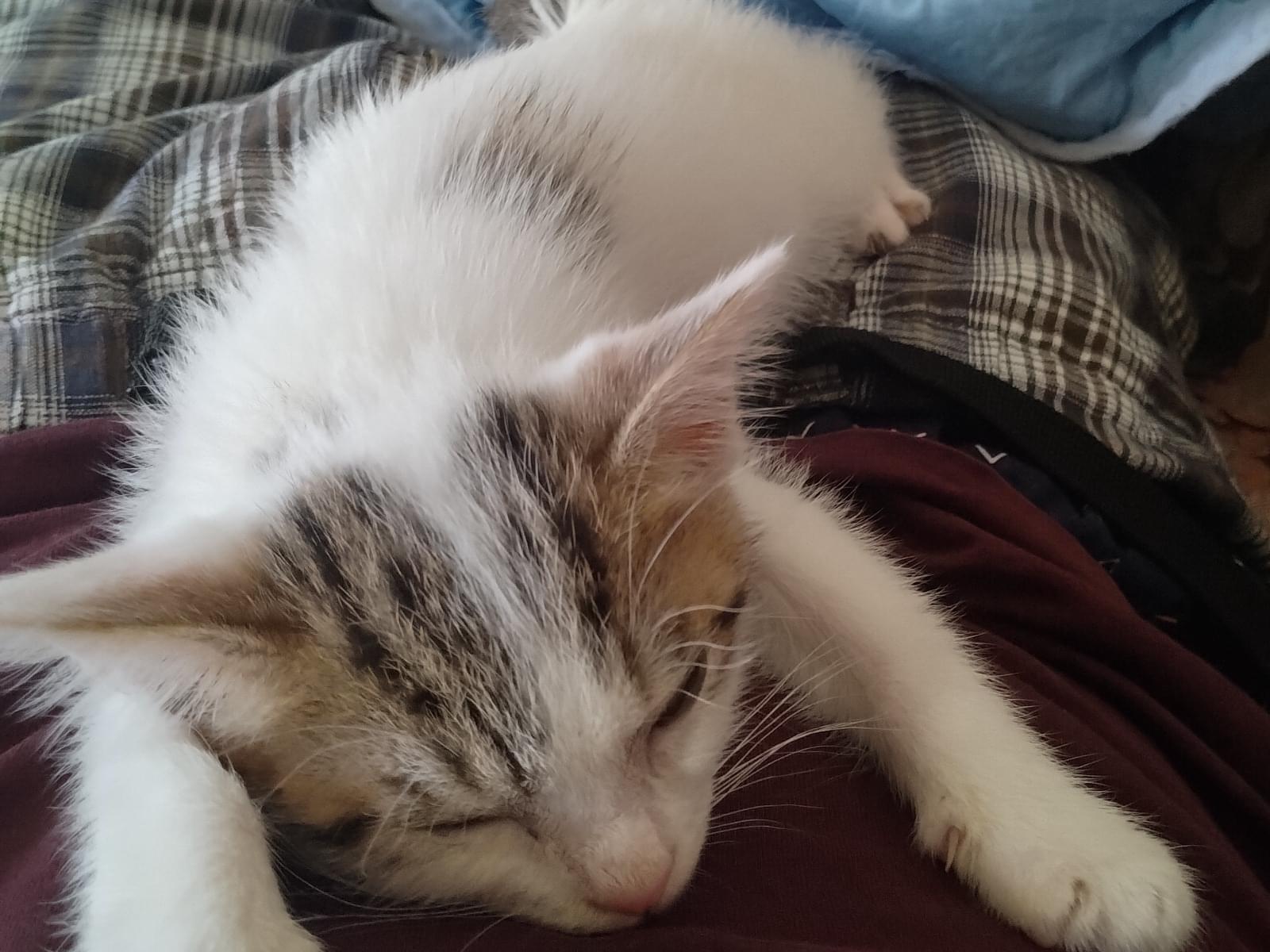 白色主体で頭と尻尾と背中の一部が縞模様の猫です。