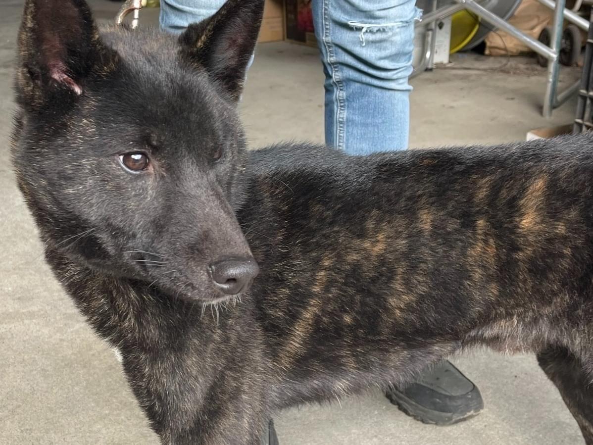 胸元の白い毛が目印の黒虎毛の甲斐犬,大人しくとってもフレンドリーな性格,首輪が外れてしまいました