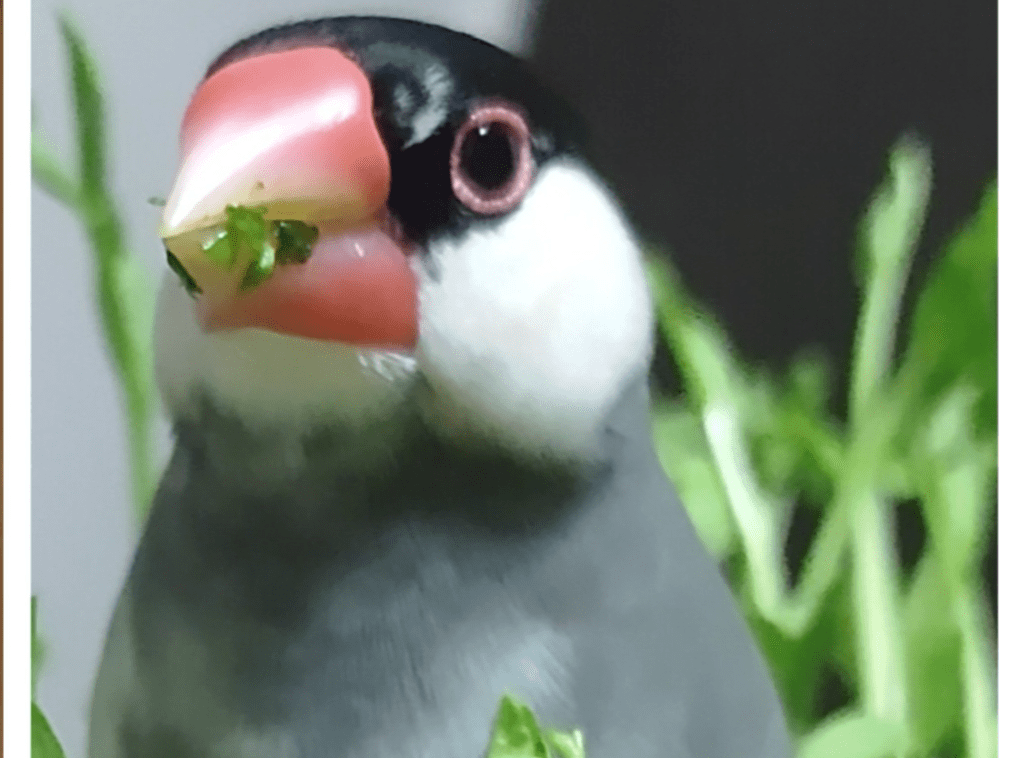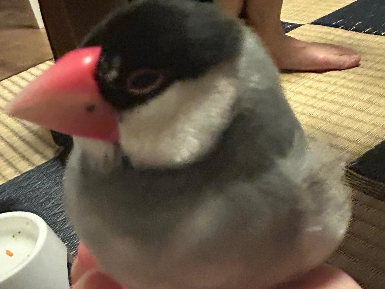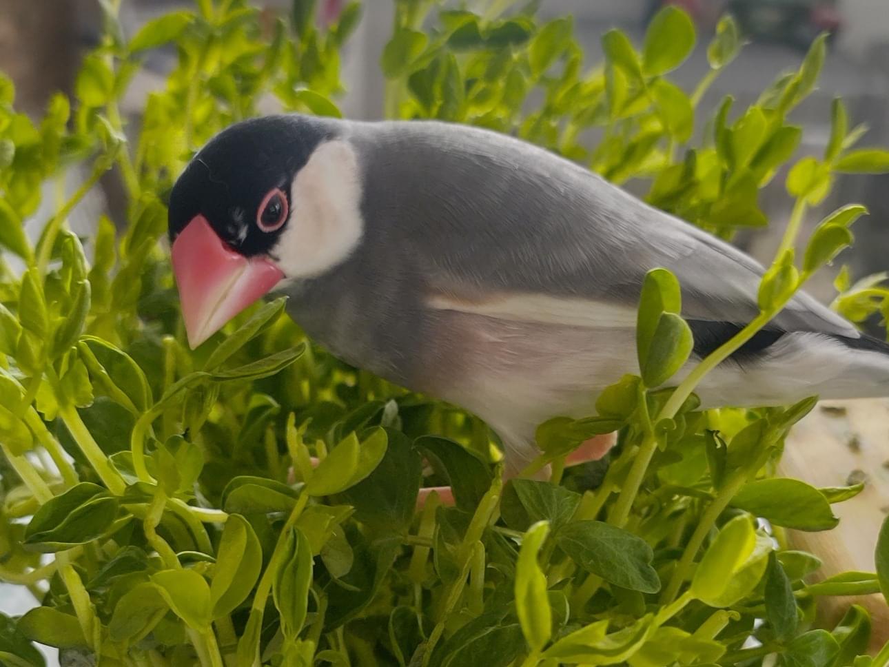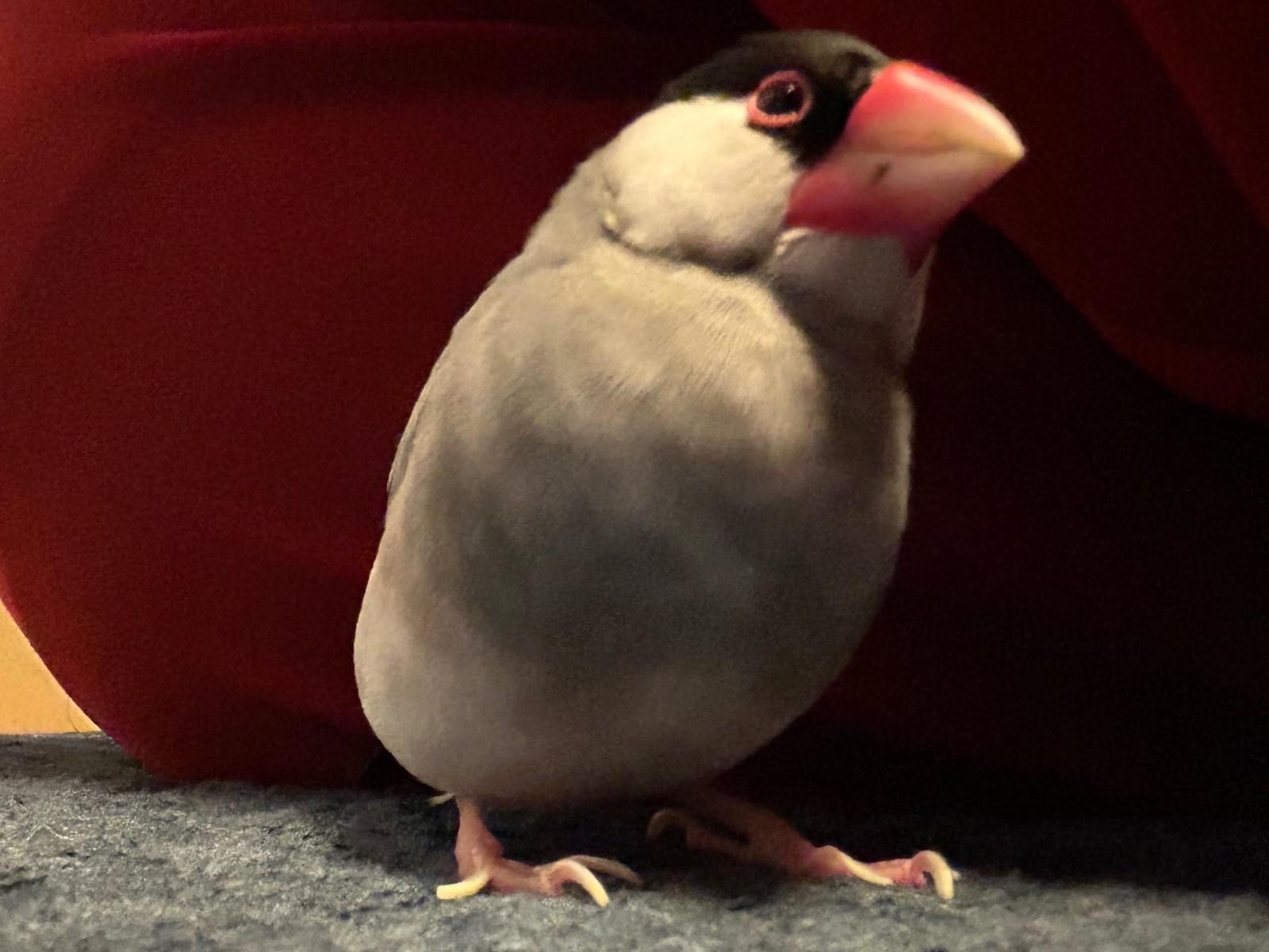 桜文鳥のパイド種。色は黒ベースで普通の桜文鳥さんとは違って腹の部分が白色です。真正面から見て右側に目と鼻の間に白い点があります。おそらくオスの子で良く飛び跳ねながら鳴いてます。文鳥さんの動画を流すと興味津々でキョロキョロしながら飛んできます。