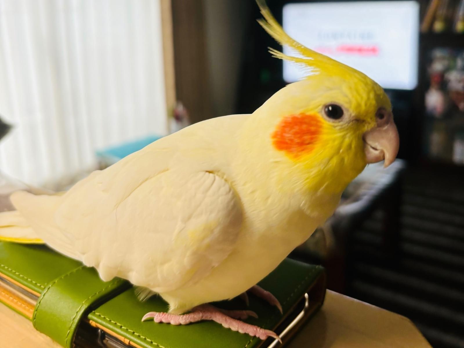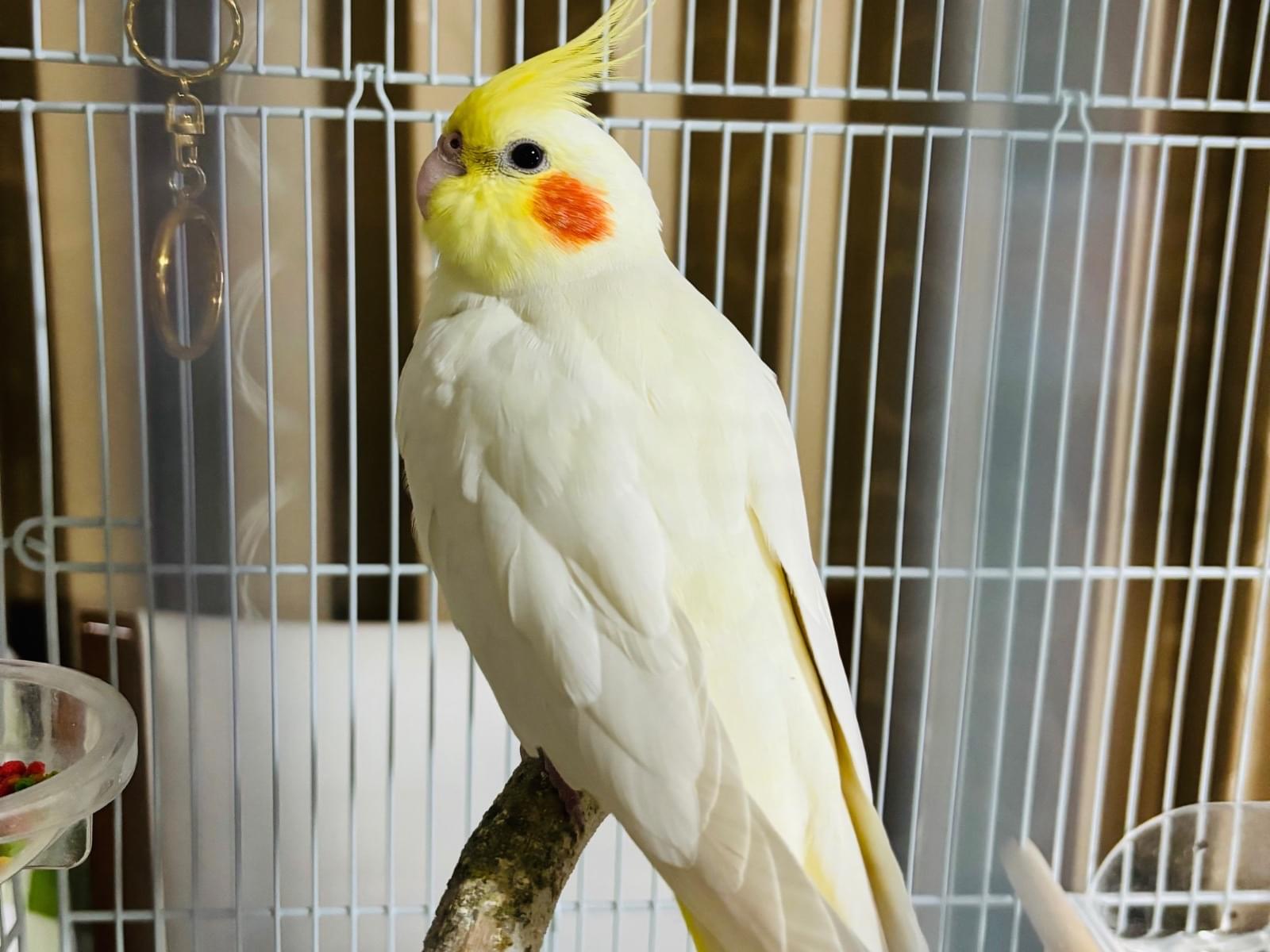 耳に赤い丸がある白くて黄色いオカメインコです。