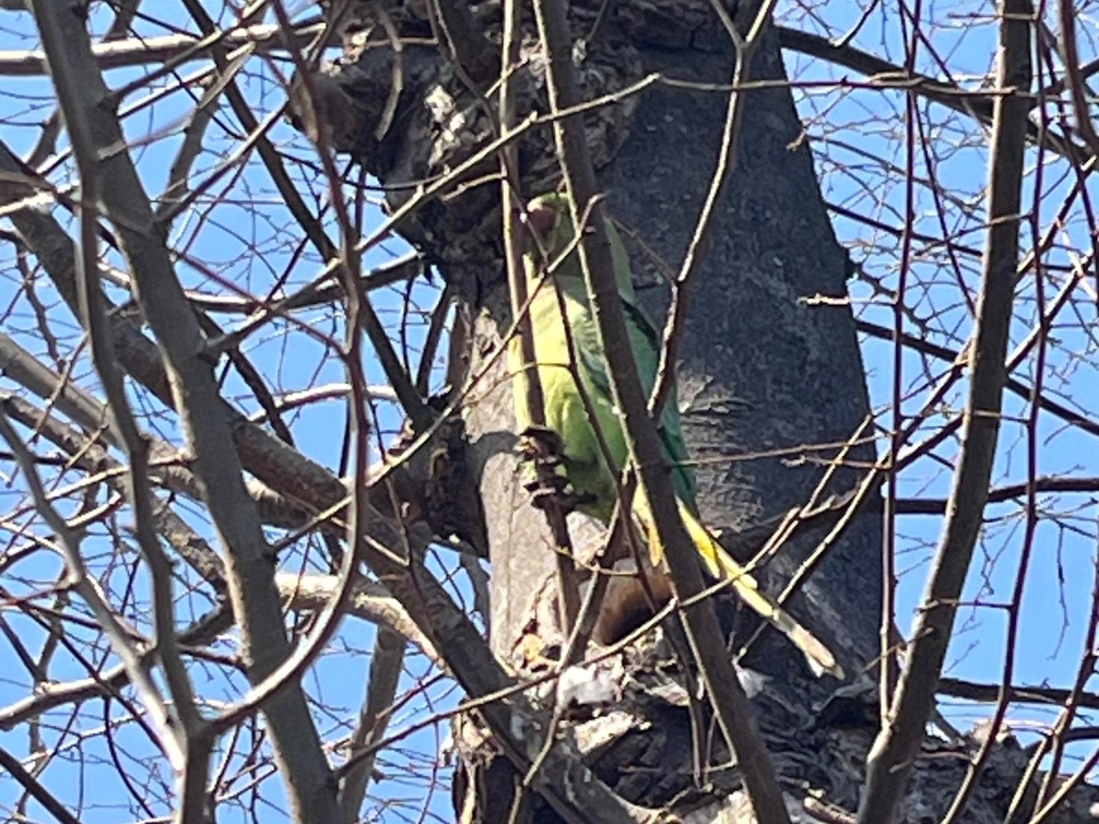 2025/3/1(土)13時半過ぎ、府中市白糸台のコメダ珈琲がある白糸台通りの街路樹にワカケホンセイインコのメス1羽(ヒゲなし)が止まりにきました。1羽だけで枝に止まってからキョロキョロする感じで脱走して間もないのかな?まだまだ寒いので心配になりました。飼い主さんの手元に戻るのが一番ですが、せめてお仲間に出会えるといいな。。