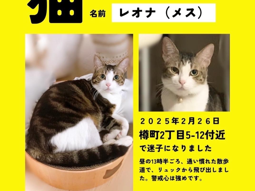 鶴見川近くの住宅街を散歩中にリュックから飛び出してしまいました。散歩が大好きで、通い慣れた散歩コース。以前飛び出した時は車の下に立てこもった後に寄って来て捕獲しましたが、2月26日は走り去ったあと行方不明になってしまいました。しっぽは長いです。キジ白ですが、アメリカンショートヘアのような柄です。紫と白のギンガムチェックのペティオの首輪をしています。マイクロチップが入ってます。避妊済み。体のお肉がすごく柔らかいです。レオちゃんと呼ぶと反応します。耳が大きく、白くて長いヒゲが立派です。もし保護してくださっている方がいらっしゃいましたら、本当にありがとうございます。目撃情報もお待ちしております。