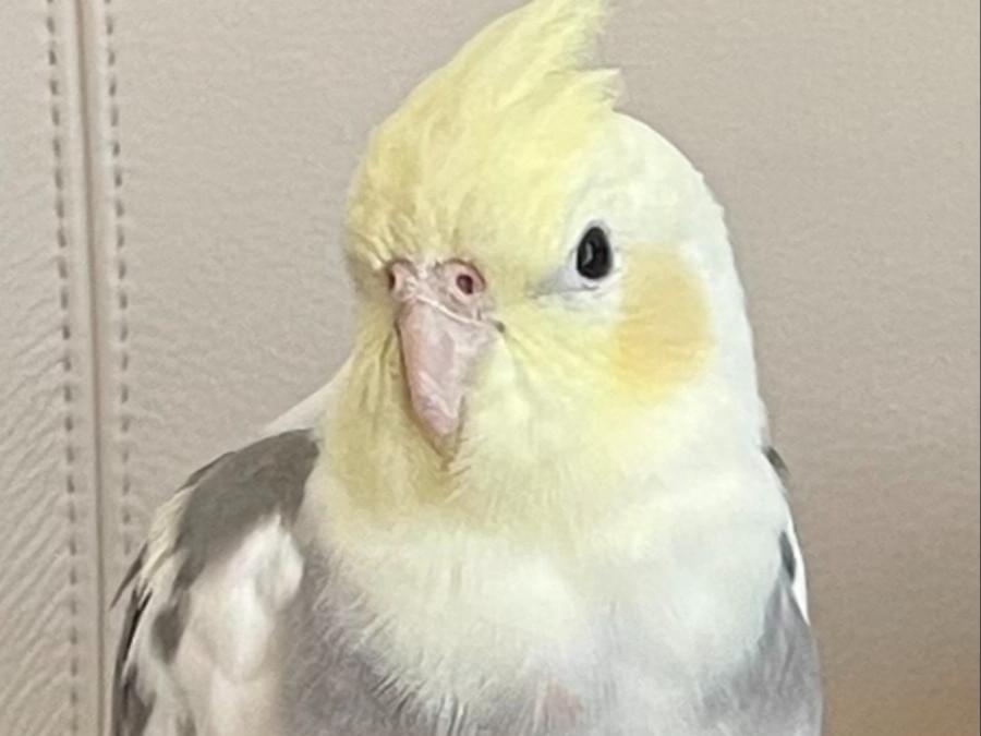 顔頭がレモンイエロー、頬が薄いオレンジ、体はグレーとクリーム色のオカメインコを探しています