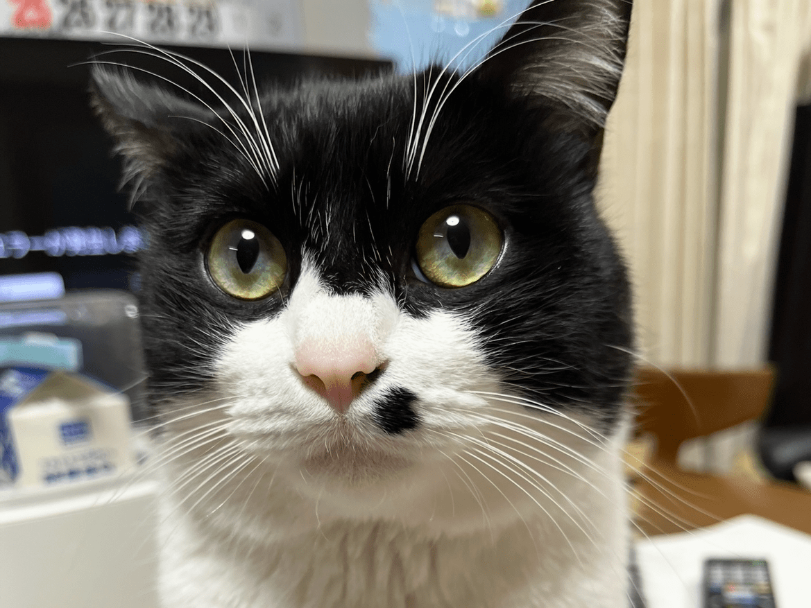 特徴は白黒で口元にホクロのような模様。しっぽは黒色。