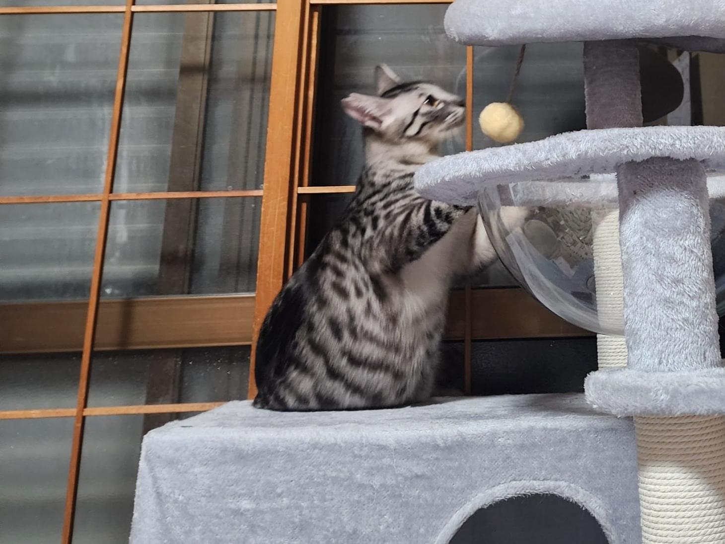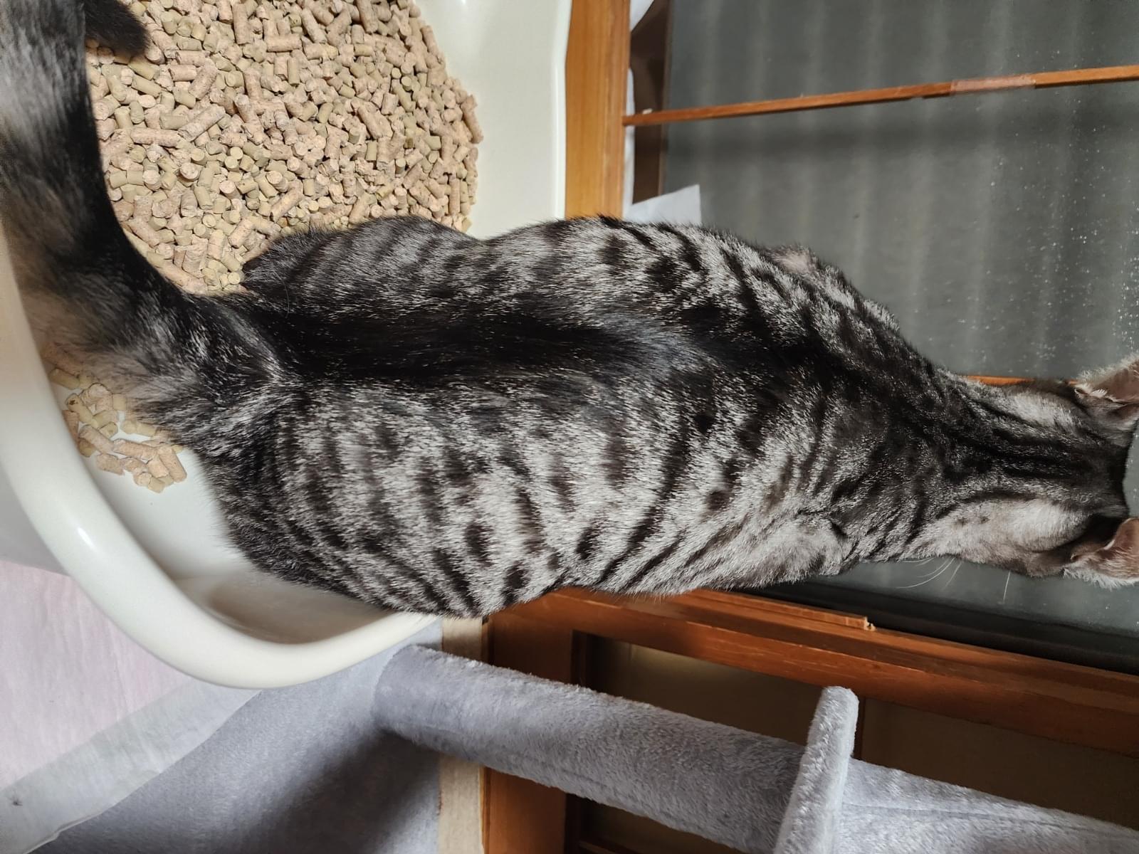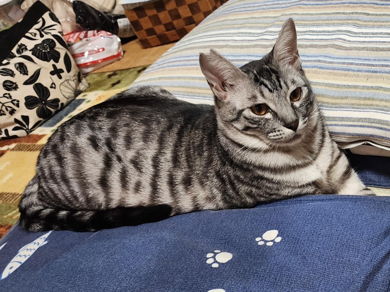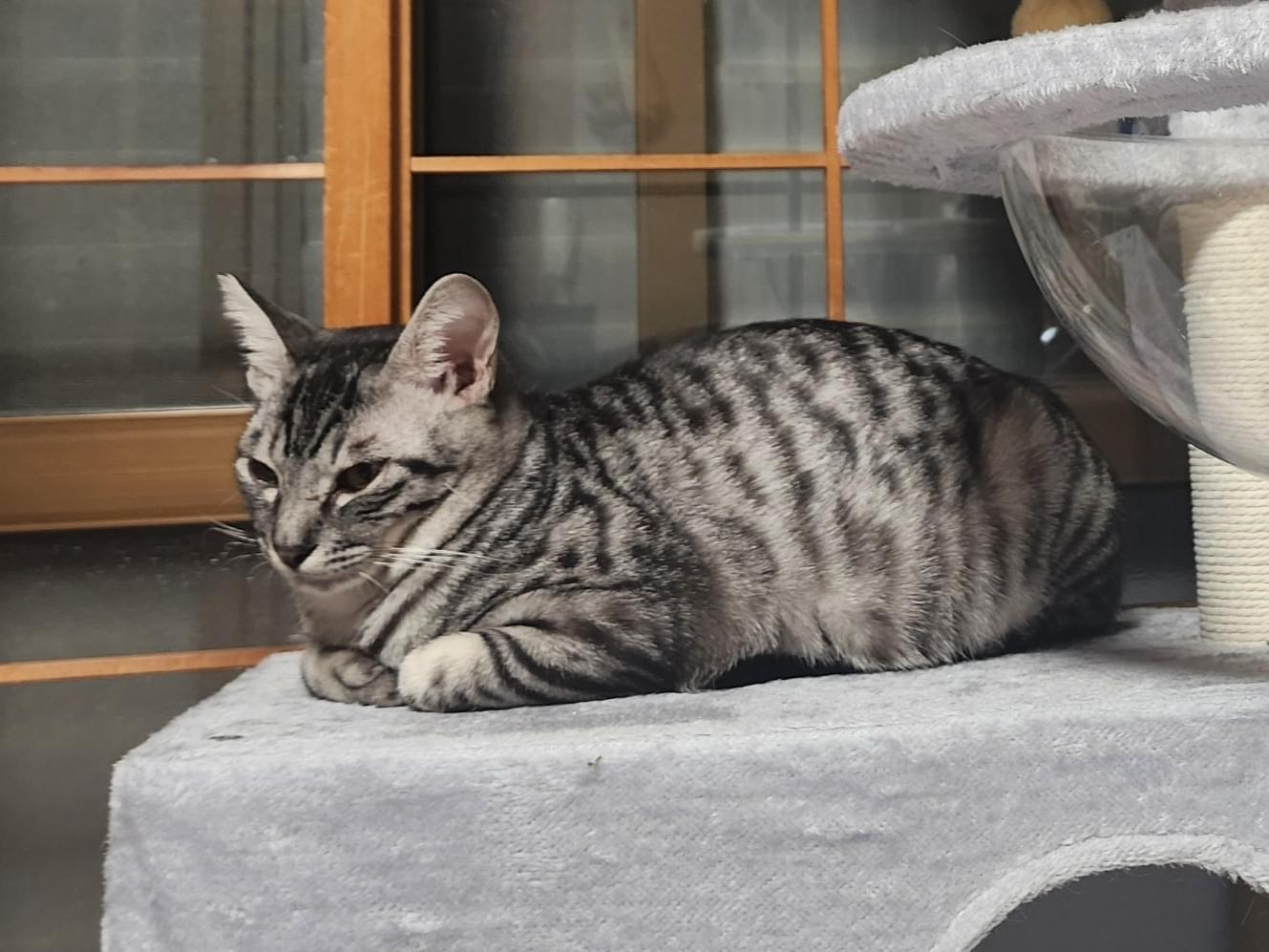さくら耳のサバトラです。 お腹が少し白く耳が大きいです。クシャミをします。