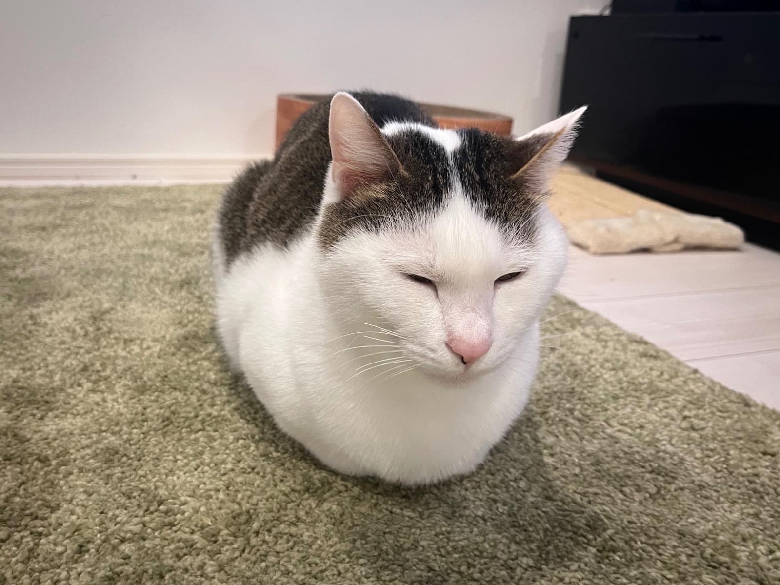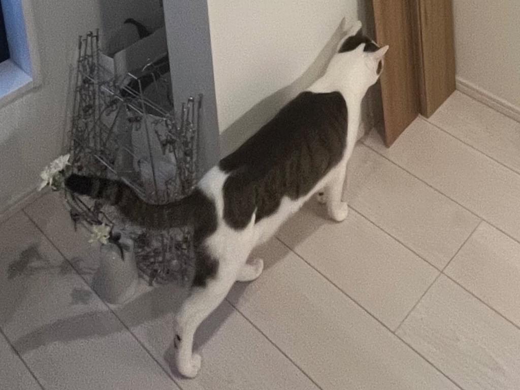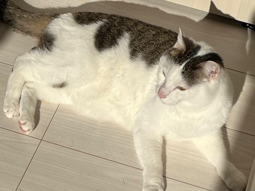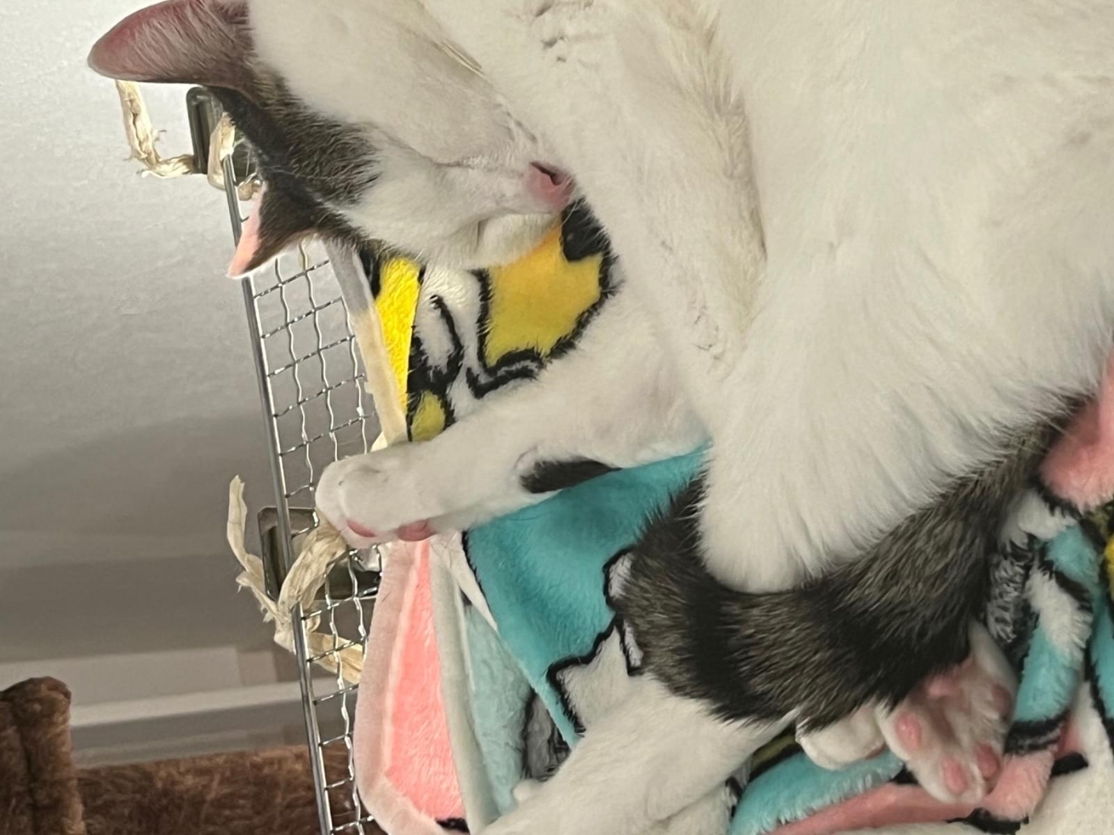 顔の柄がセンターパートっぽく額のところで別れてます。足に黒い点があります。