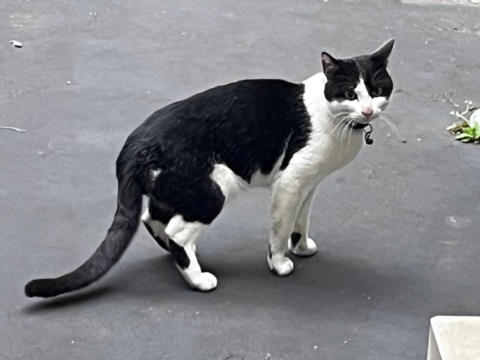 鈴のついた首輪をした白黒ハチワレを目撃しました。