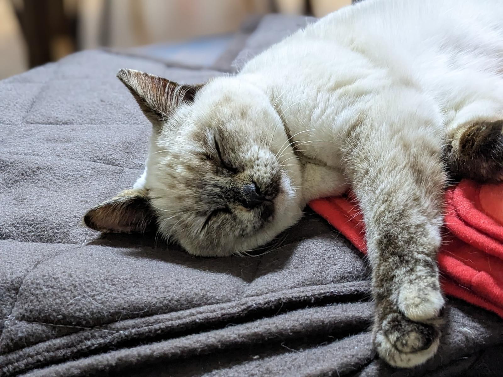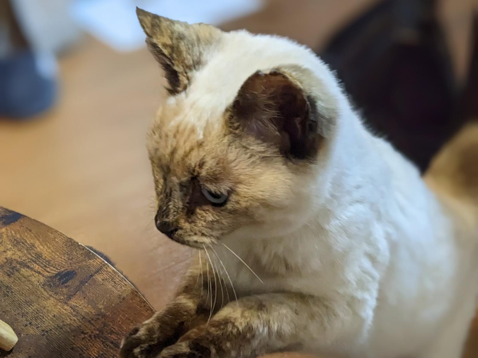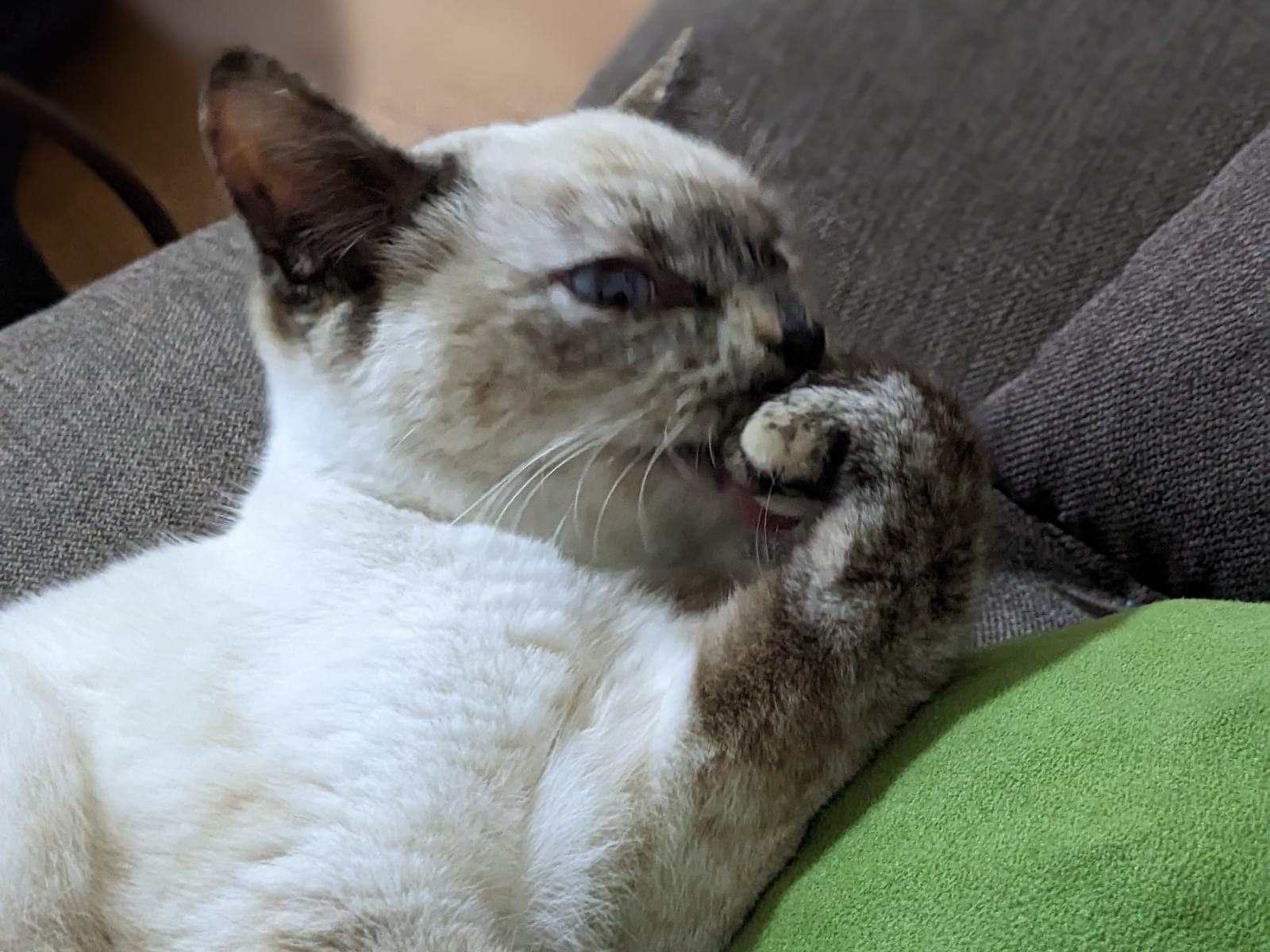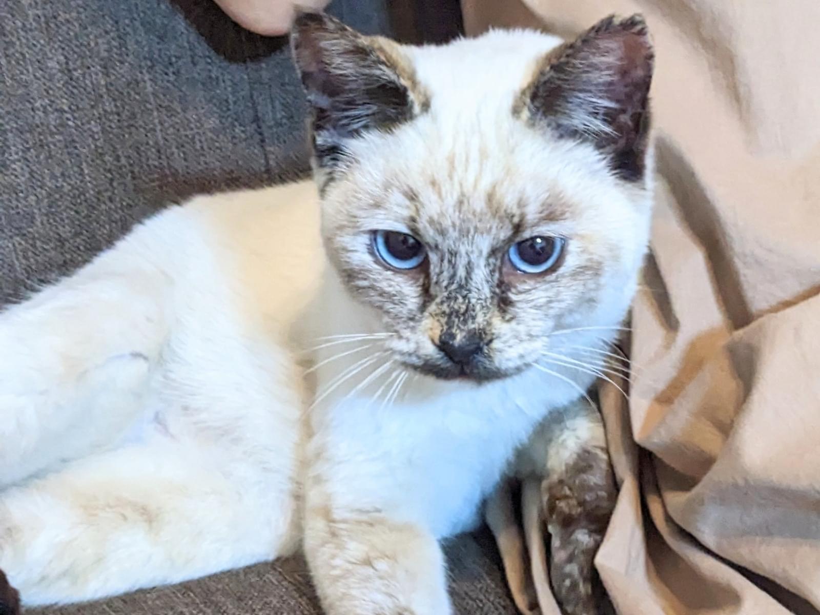 シャム猫と三毛猫が混ざった感じです。