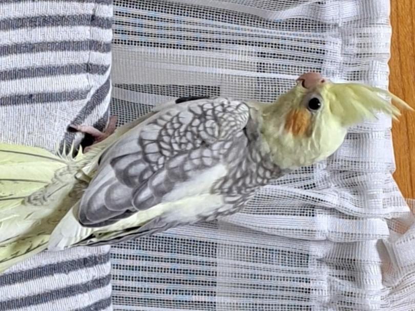 性格はオカメインコ特有の臆病です。手乗りトレーニング済みで慣れれば肩や頭にも乗ります。