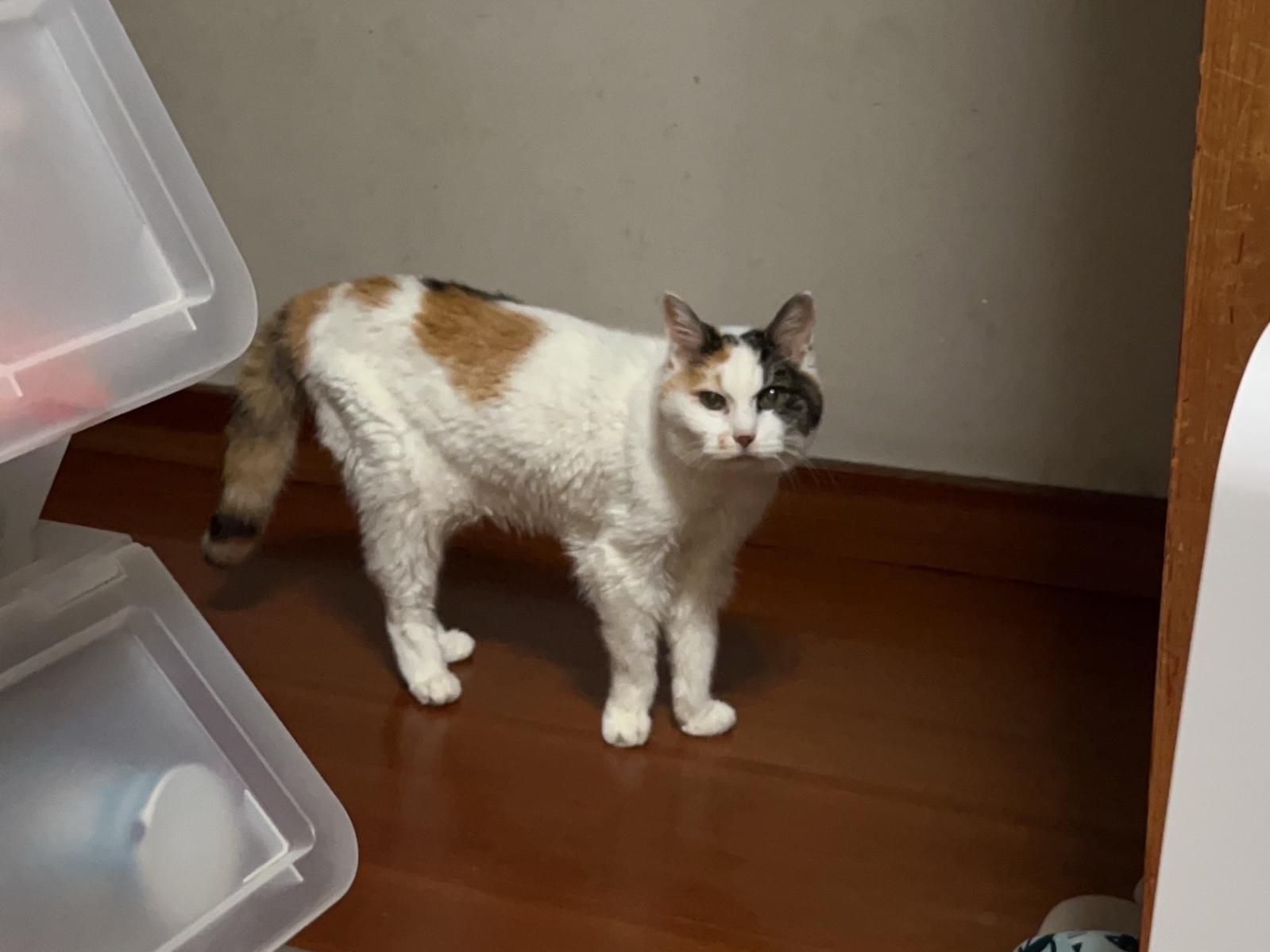 ミケ猫 雑種 首輪、チップなし 避妊済み(耳カットなし)