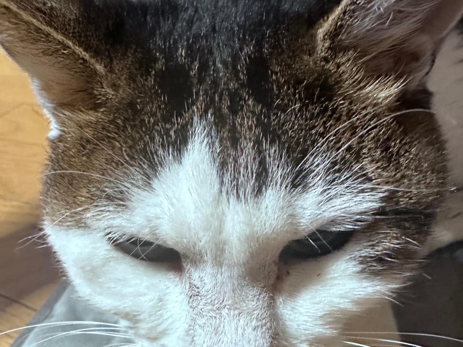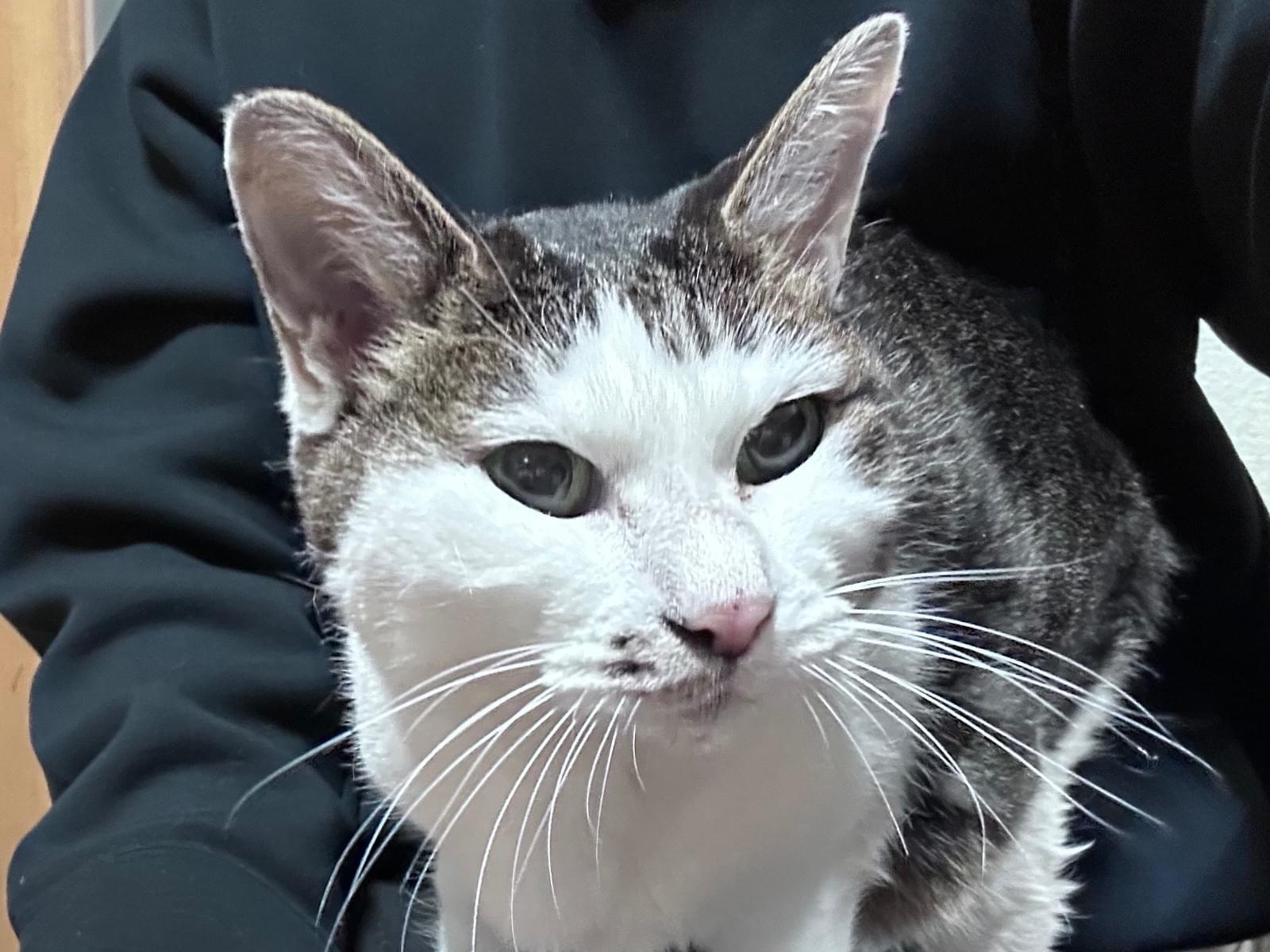2月18日午前2:30頃に散歩に出かけてから戻らず行方不明になりました。家にいる時からほとんど鳴かない子でしたが、最近は認知症の傾向があり誰かを探すように「アウォーン」と鳴くことがあります。いなくなる晩に帰宅した際、目ヤニが普段より酷く風邪を引いていた可能性が高いです。白内障もあります。顔の柄は失敗したような前髪、後頭部がハチワレている様に見える柄です。背中からしっぽにかけてはキジトラで、首胸お腹足は白いです。毛量が多いのに毛繕いをしないため毛割れして抜け毛も多いです。体重は2.8~3.0kgでした。毛量が多いので体重の割には小柄に見えないかもしれません。右の腰(モモの付け根)辺りにコブのようなものがあります。