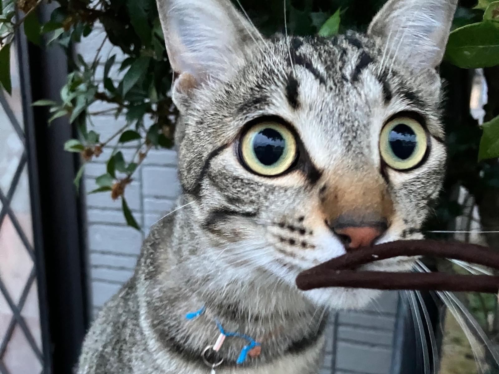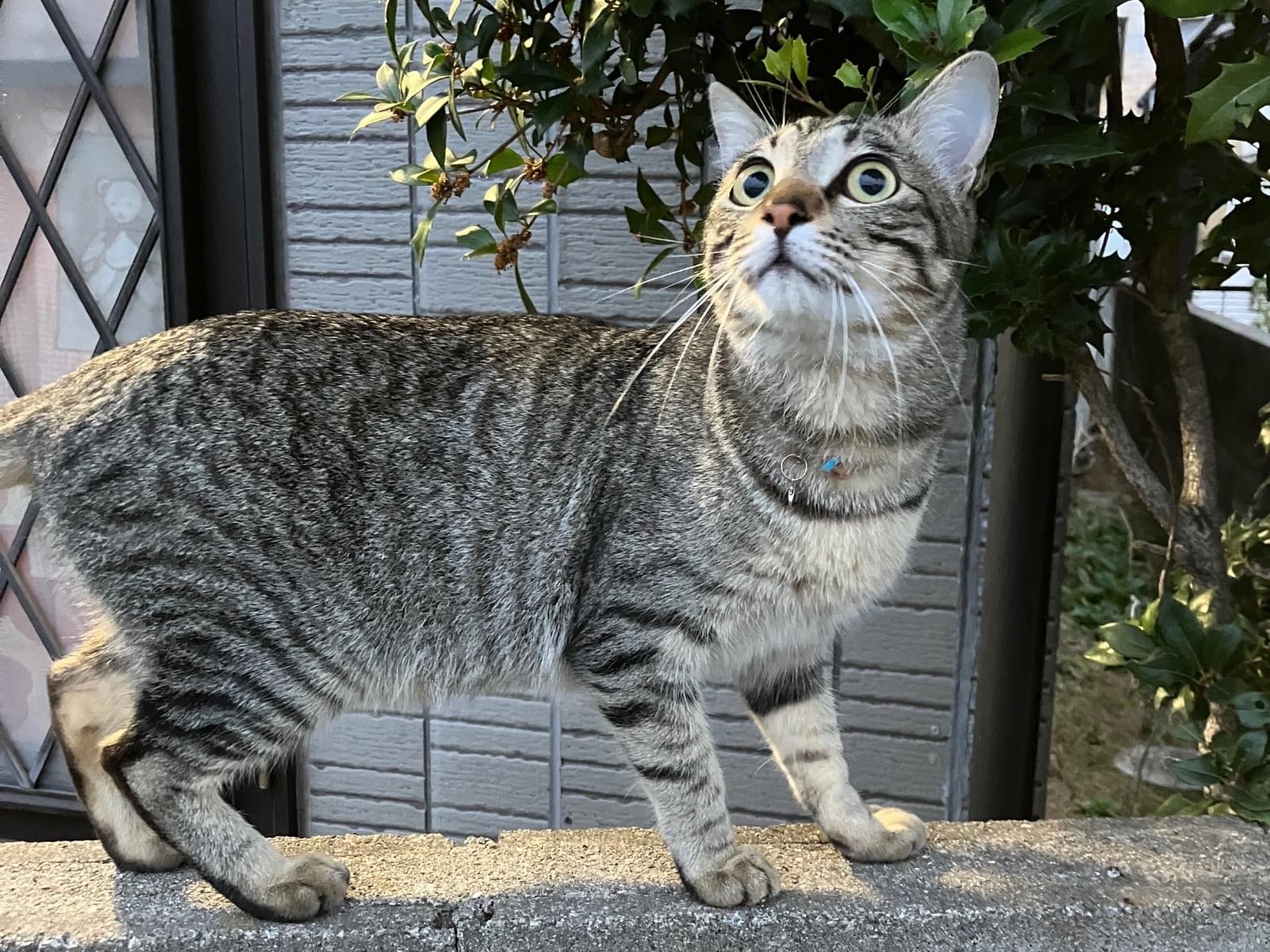 青い首輪をしたキジトラ?の猫ちゃんがいました。