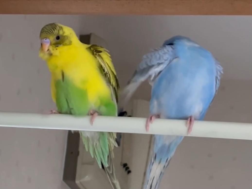 セキセイインコのぴーちゃん黄色に黒の柄下半身が緑色、臆病な性格。おしりを振るポーズをします。