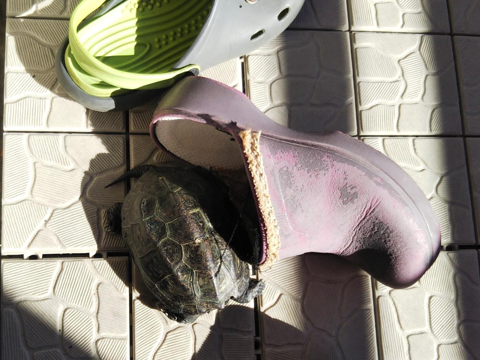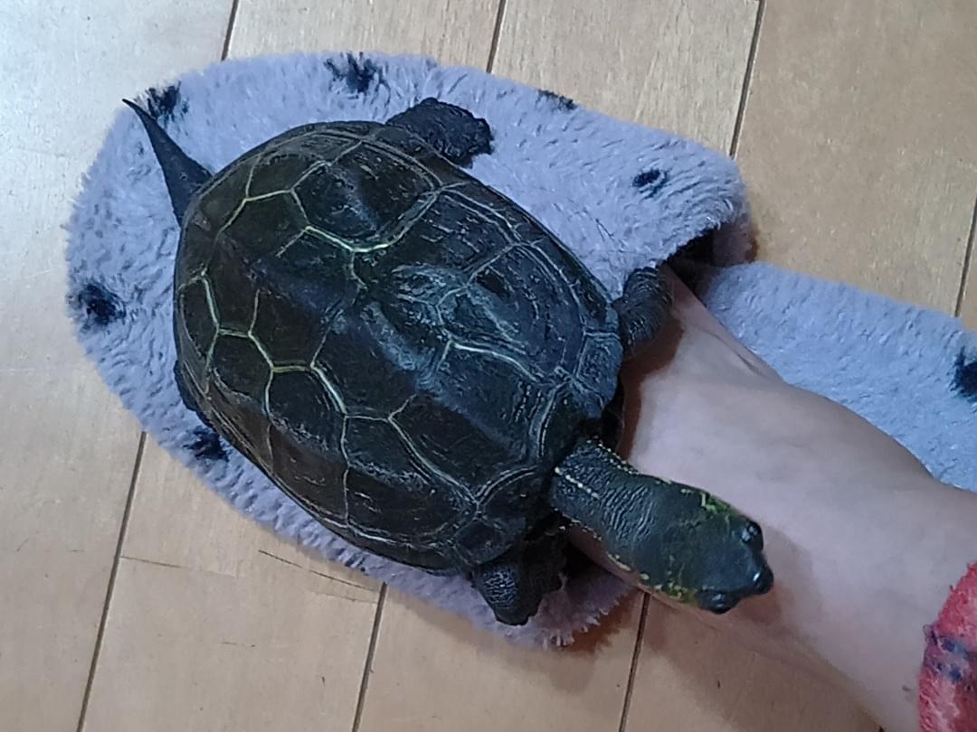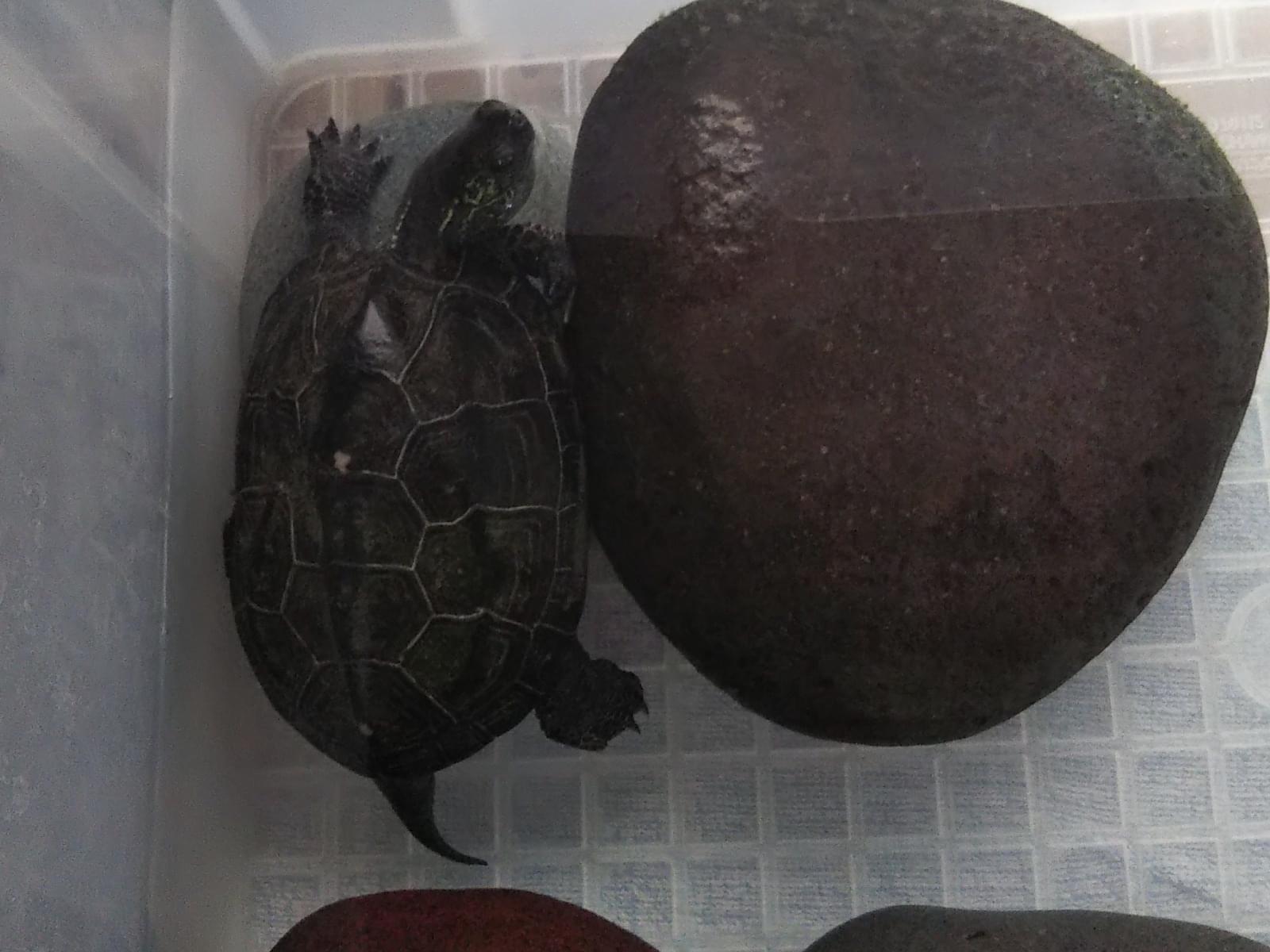 甲羅は黒系の少し緑がある感じなので、一見大きい石に見えます。イメージは土手などのコンクリート面、ボルダリングのような感じの埋込みの石と似ています。