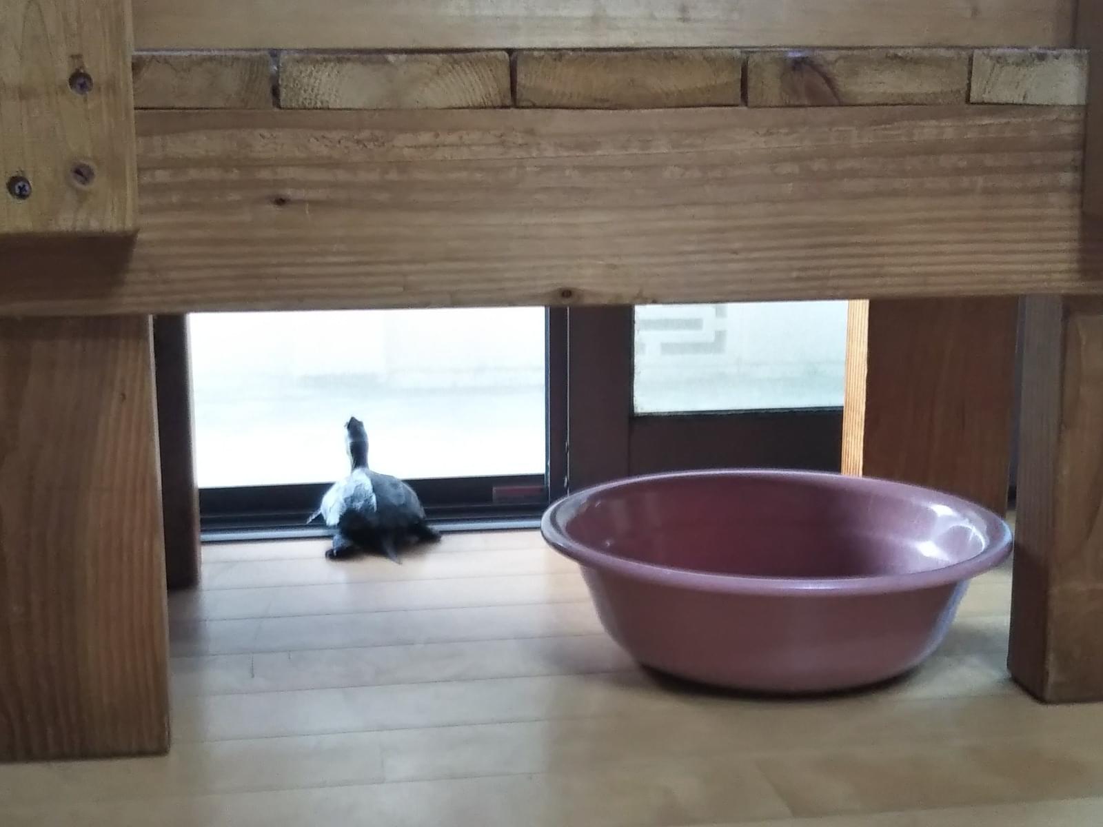 いつもは部屋の中の水槽でヒーターを入れ、餌を直接あげながら(首を伸ばし口を開けて待つので)過ごしてます。