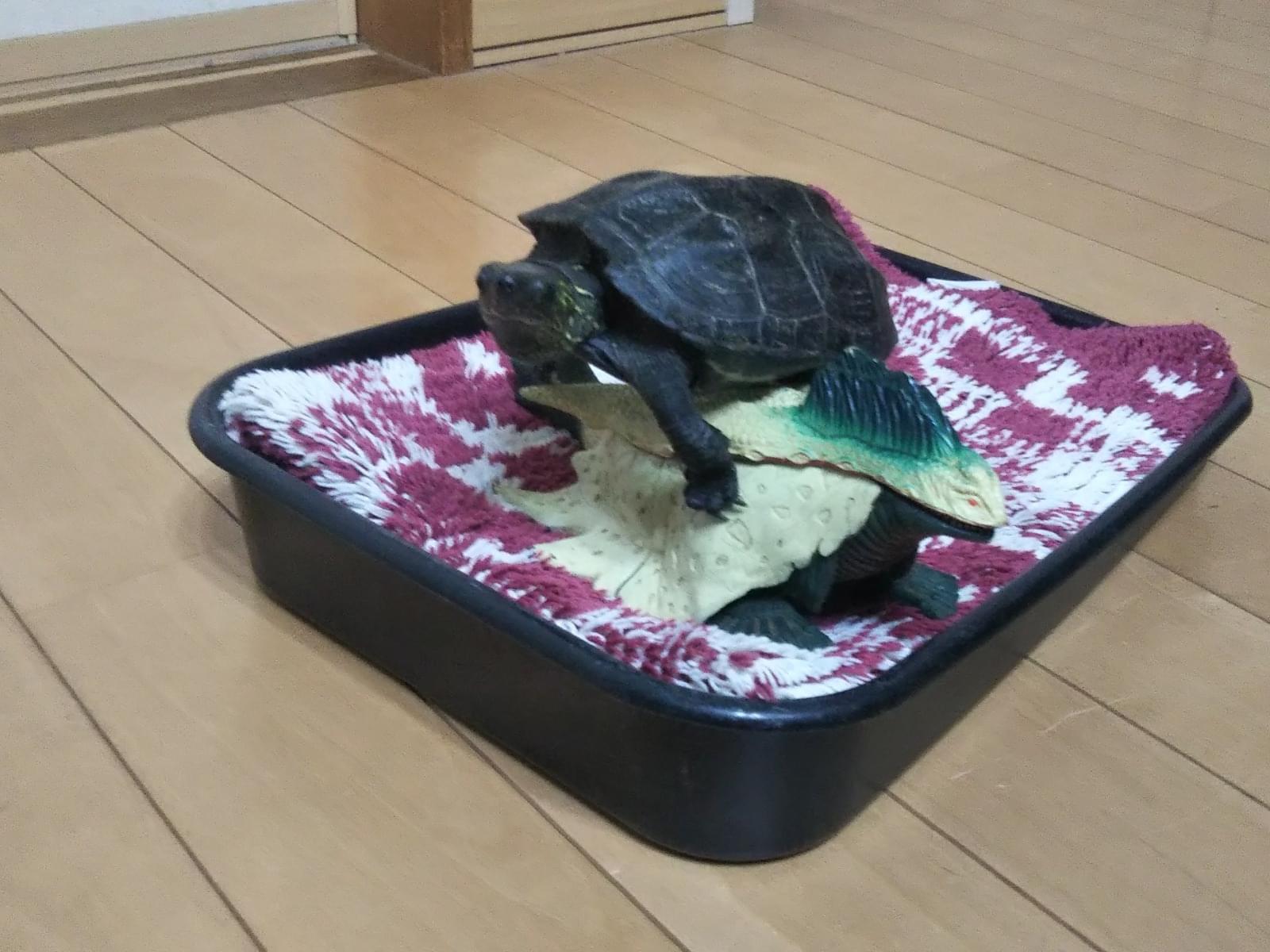 基本の部屋の水槽が自分の住む所と思っているかのように、ゆったり手足を伸ばして無防備に安心して寝てます。