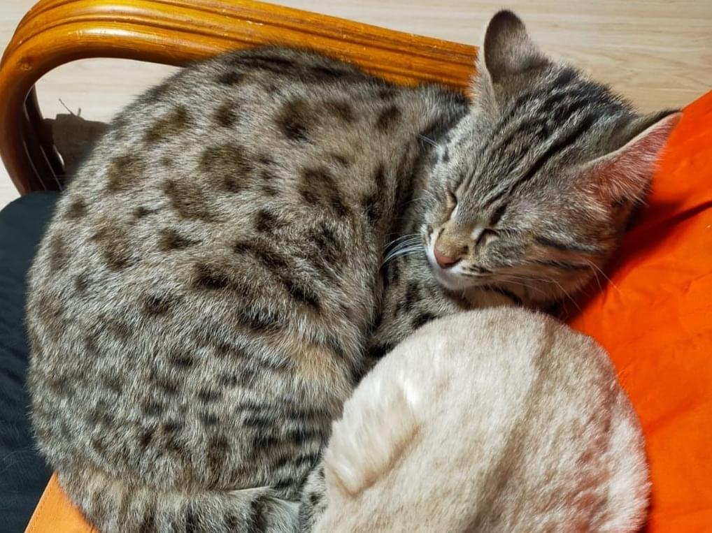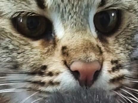 茶色で斑点模様の尾が太い猫