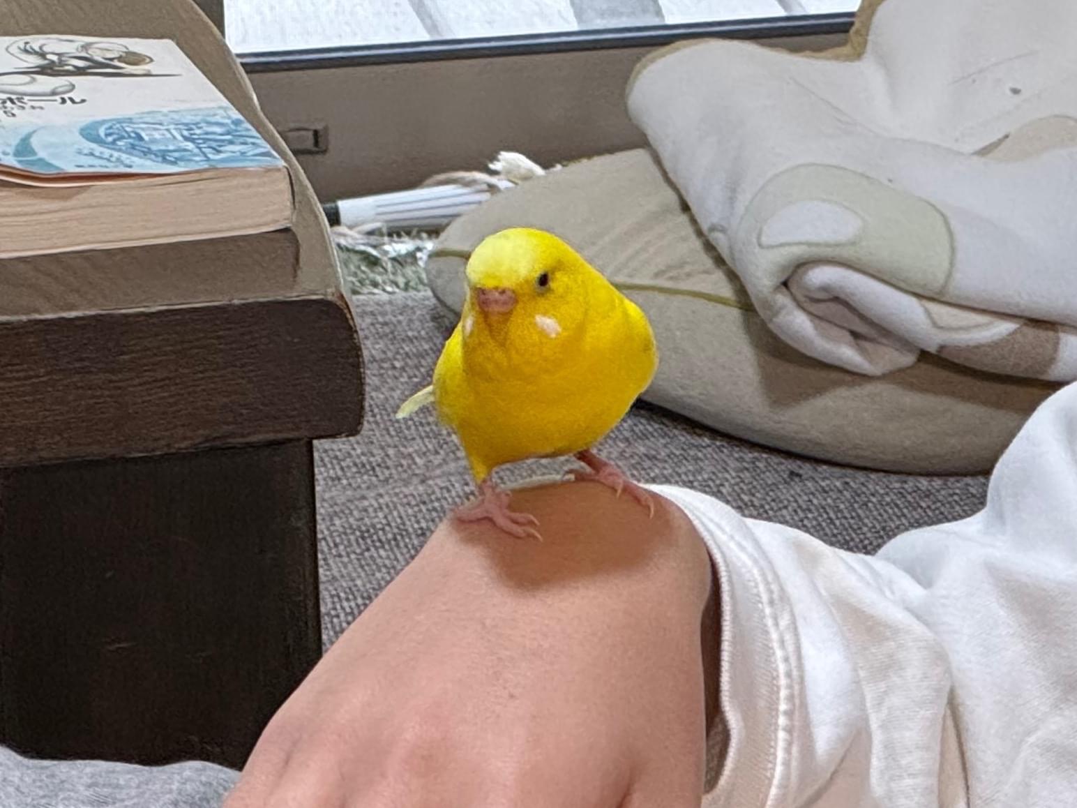 近づくと怖がって逃げてしまうので、声をかけてもらうと肩に乗ってくると思います。