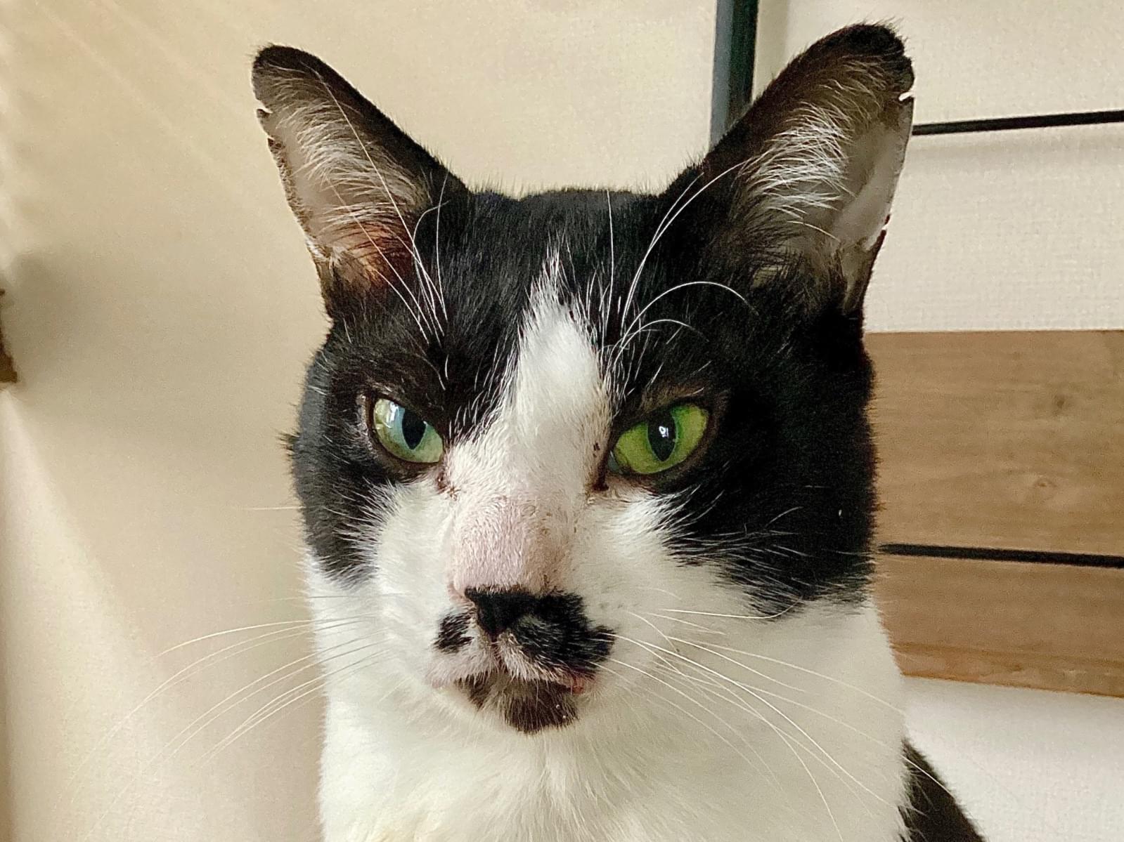 口元に黒いブチ、昼間は黒目少なくコワモテです。