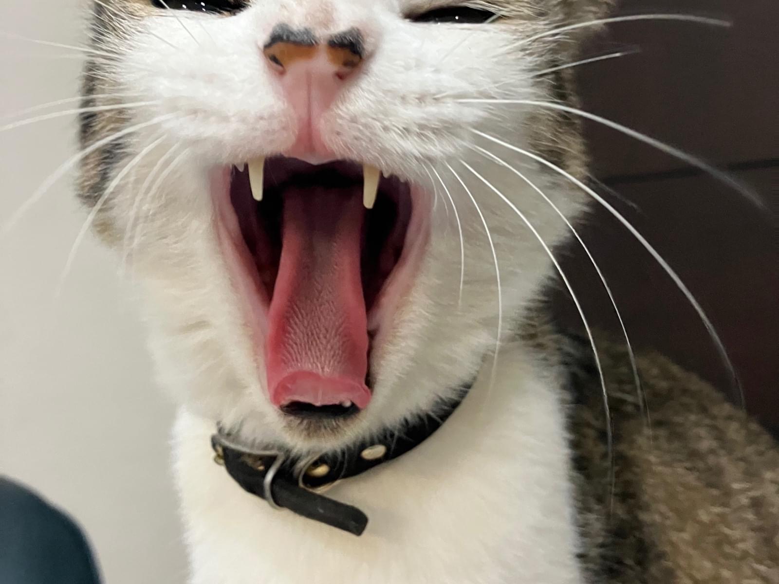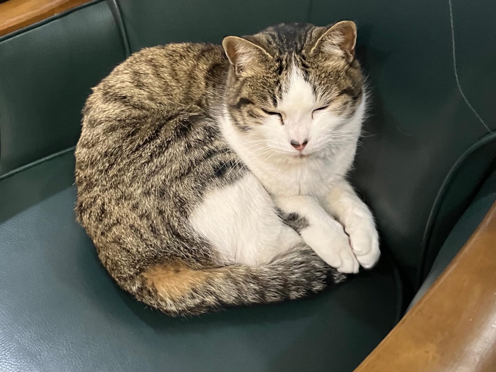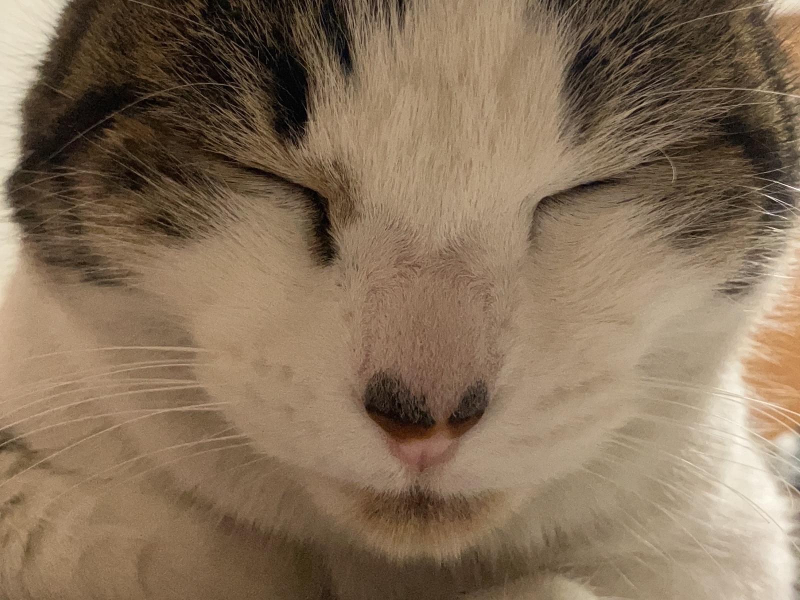 キジ白で、前脚に薄くトラ模様があり、鼻にブチがあります。